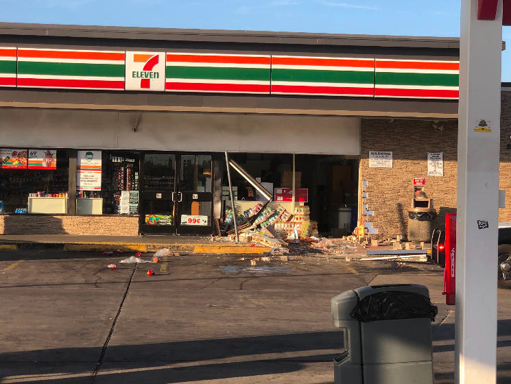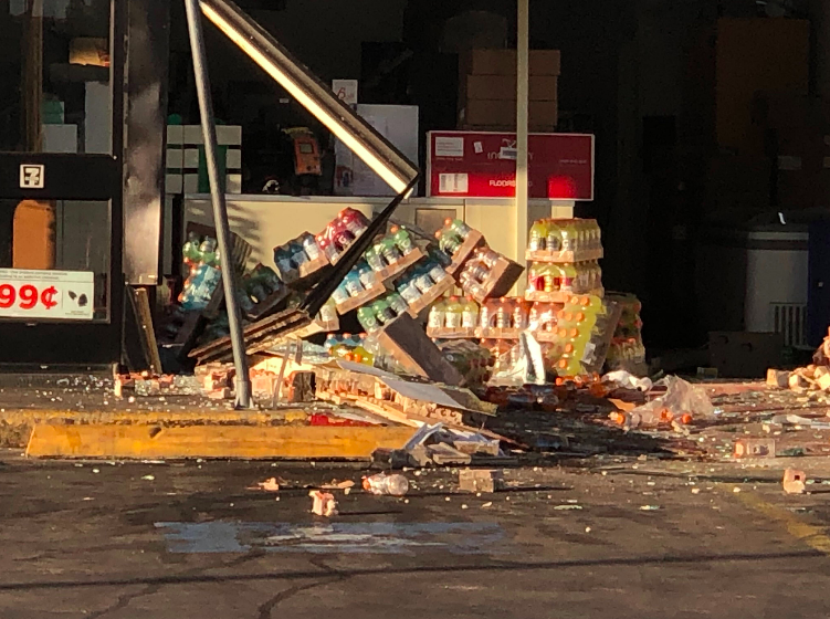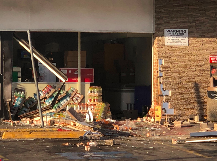The force caused a portion of the exterior wall to crumble. Photos of the business show multiple broken windows, with products and debris spilling onto the sidewalk.