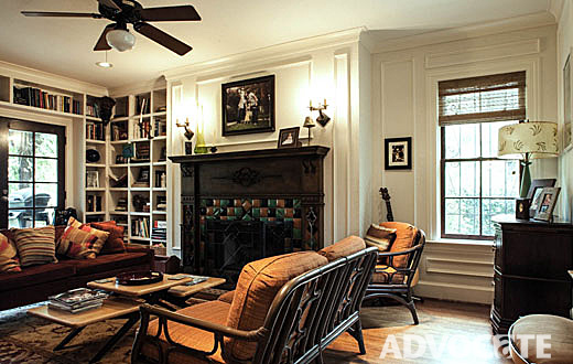 Gantt turned that fire-damaged room into a den, where the Loveland family now keeps books, artwork and comfy furniture. A signature of Hutsell homes is thick plaster walls with swirly designs and crown molding. Gantt was able to copy that trait so well that it’s hard to tell the room has been renovated. She also added a fireplace to the room, copying the design of another Hutsell house down the street, and she pulled in colorful vintage tiles similar to those Hutsell would’ve used.