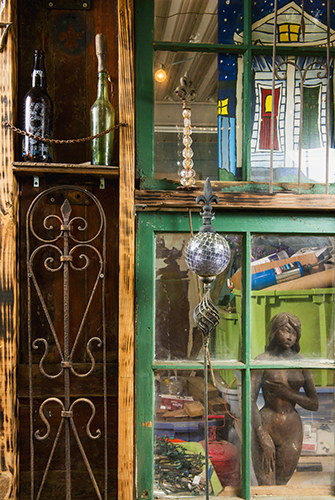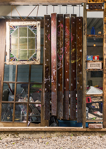 Before the Mansons bulldozed their home in New Orleans, they collected windows, doors, floorboards and other pieces, and Mark Manson used the pieces to create a wall in their new backyard. Photo by Danny Fulgencio