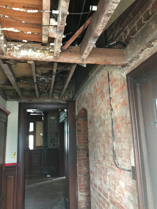 All of the ductwork in the back of the house will have to be replaced. The floors need refinished, as well as the plaster that was removed from the walls. Without the plaster covering, workers discovered electrical conductors wrapped with fabric instead of plastic, and that will also have to be replaced. The downstairs bathroom walls and a door must be completely rebuilt.