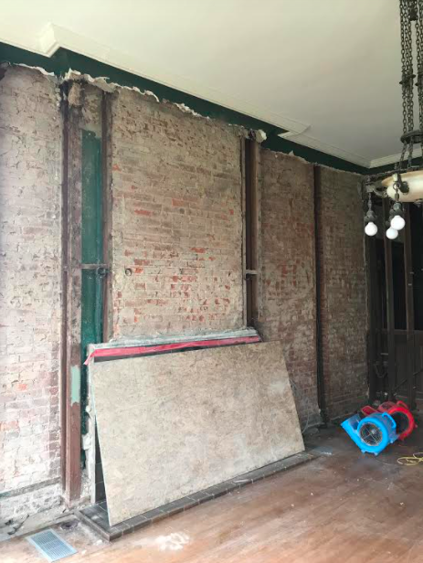 Water spilled into the ductwork, causing it to collapse, and gushed into the first-floor walls and basement. The walls, which are 18 inches thick with brick and plaster, did not dry quickly. Much of the plaster and wood paneling had to be taken down. Two months later, one wall is still drying.