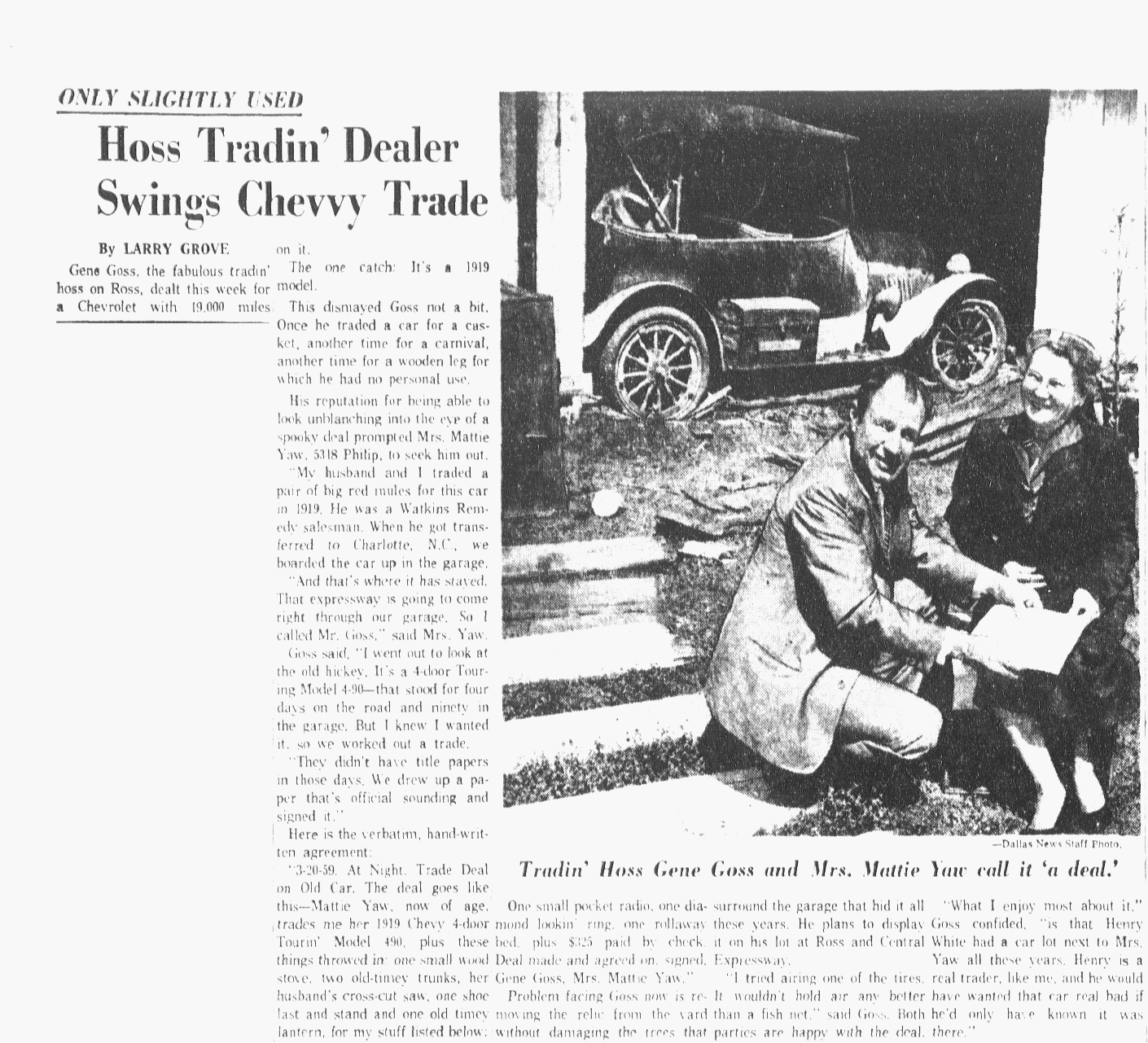 One of his regulars was Gene Goss, who owned Goss on Ross Tradin’ Hoss, a used car dealership on Ross at Akard. Goss was a legitimate businessman, who parlayed a $10 investment into two successful dealerships. But he had a little bit of thug in him too. He kept a staff of goons who collected late payments, and in the back of his shop, he kept a coffin with a mannequin inside. He’d say, “That guy was two weeks late,” Hearn recalls. Goss died in 1984.
