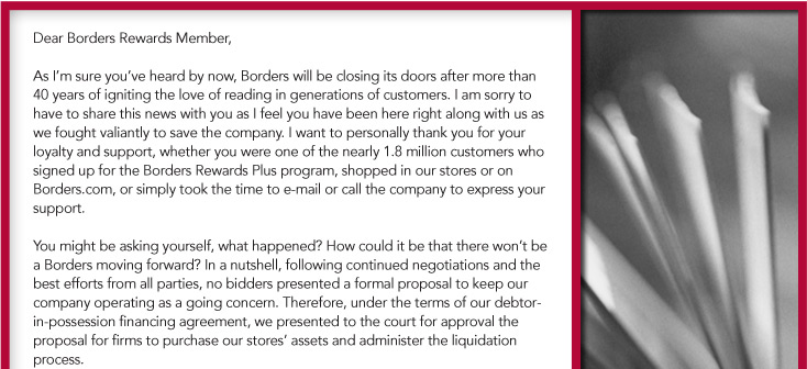 “We had worked very hard toward a different outcome. The fact is that borders has been facing headwinds for quite some time, including a rapidly changing book industry, the eReader revolution, and a turbulent economy,” Edwards states in the letter. “We put up a great fight, but regrettably, in the end, we weren’t able to overcome these outside forces.”