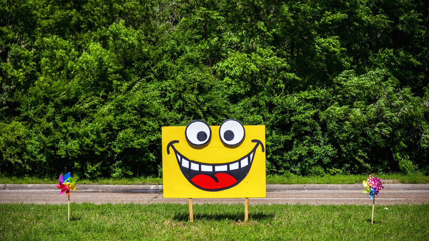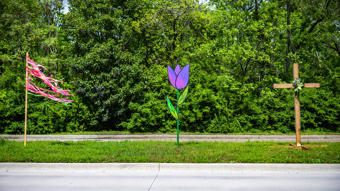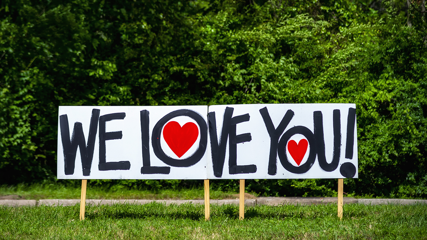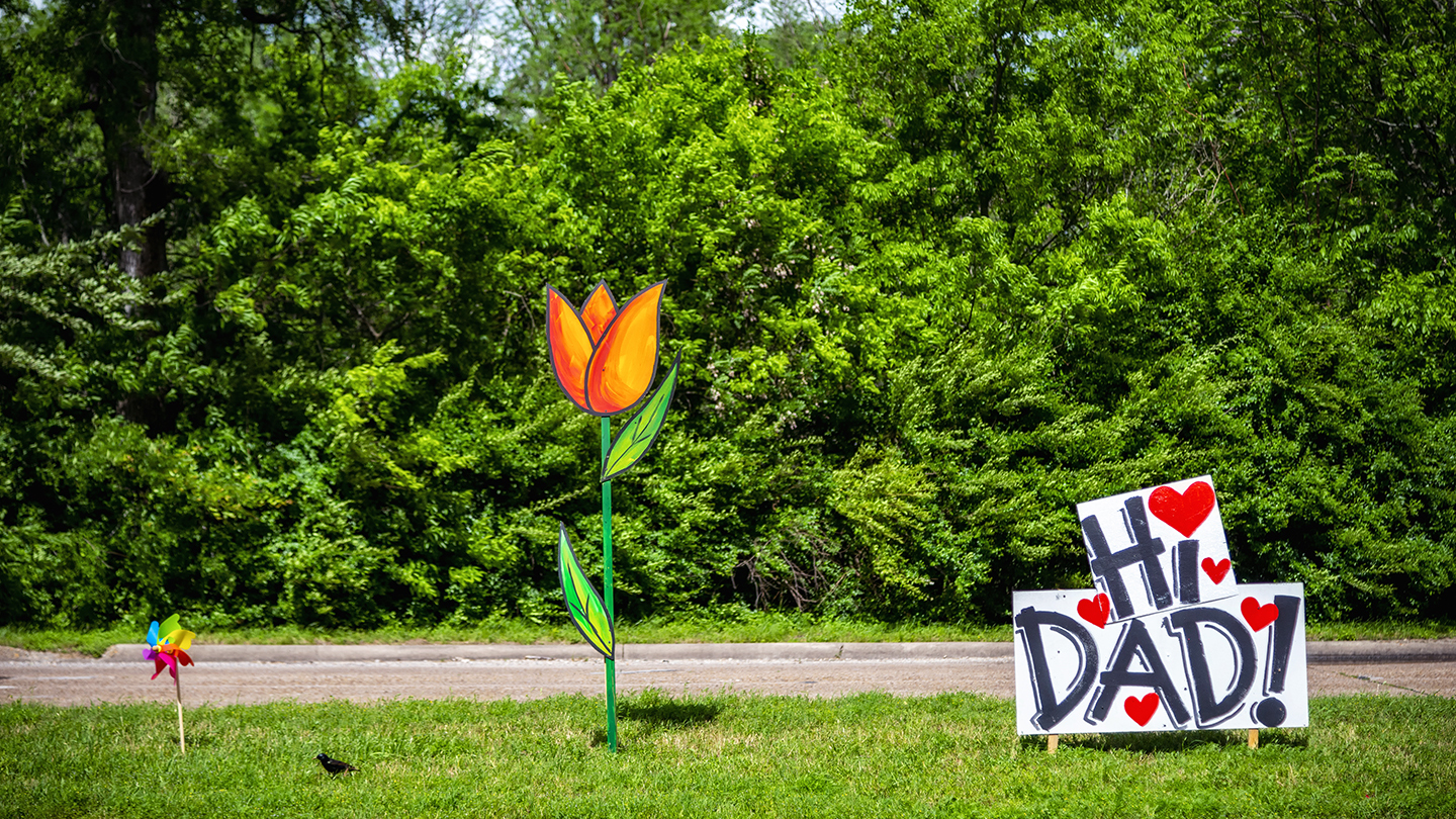 In the median across the street from CC Young, they planted encouraging yard signs, pinwheels, streamers and more.