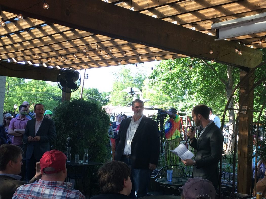 The Wood and Kingston signs alternating between yards in the surrounding Junius Heights and Munger Place historic districts underscored just how close of a race this appears to be. Kingston showed up in a checkered blazer and jeans, Wood donned a navy blazer and beard, and both shook hands as they made their way around the crowd. The Kingston campaign wisely set up next to the beer and wine station, doling out T-shirts and yard signs, while the Wood campaign passed out “Matt Wood” emblazoned nametags.