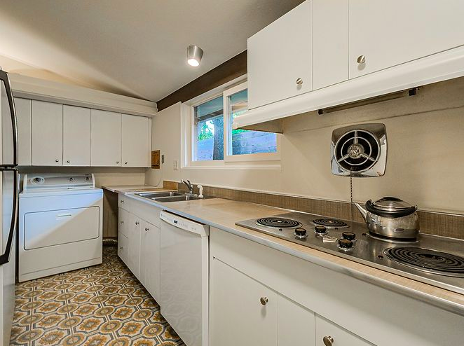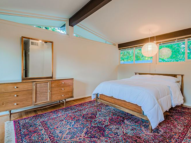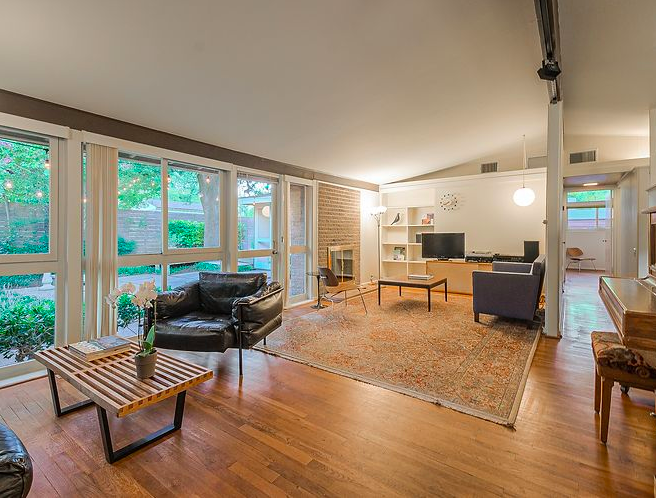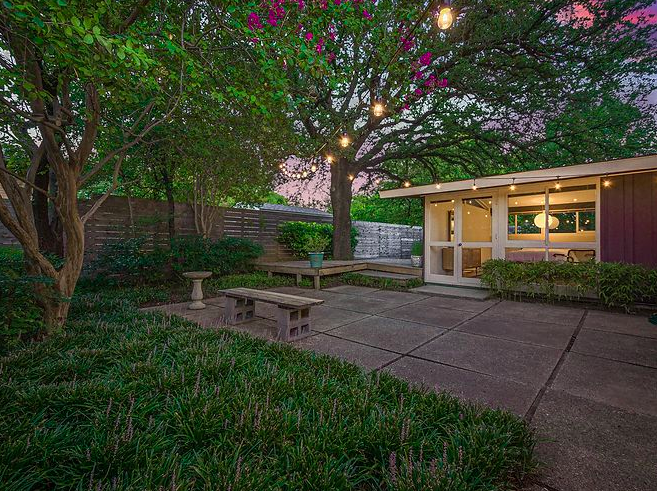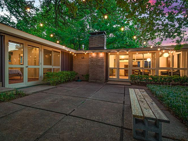 The mid-century modern home also comes with an 8-foot privacy fence, two storage units and a garage workshop.