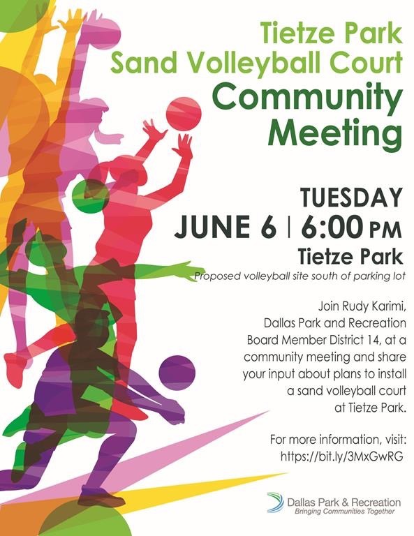 Friends of Tietze Park is holding a public meeting June 6 regarding the addition of a sand volleyball court to the park.