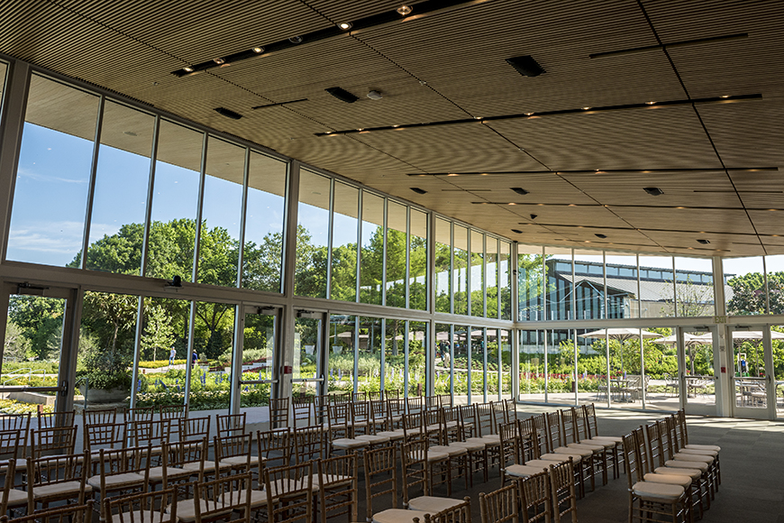 The structure, designed by architect Russell Buchanan (right), and the garden, designed by Chuck McDaniel, are design triumphs, according to Mark Lamster, architecture critic for The Dallas Morning News. The pavilion, a glass box with floor-to-ceiling windows, was described by Lamster as an exceptional work of modern public architecture. “Above, a roof of wooden slats conceals recessed lighting, and angles up like the wings of an airplane on the exterior of the structure, creating a broad overhang that shields a generous patio from the sun and the elements,” Lamster says.