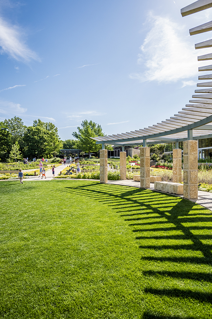 Naud Burnett’s Kevin Clark worked on the lagoon’s design. Before development, the location had been a debris-filled drainage area. The pond that fills the space captures groundwater and is the largest body of water in the arboretum. It is hemmed in by a bridge, and a fountain is lit at night, spraying changing colors 20 feet in the air.