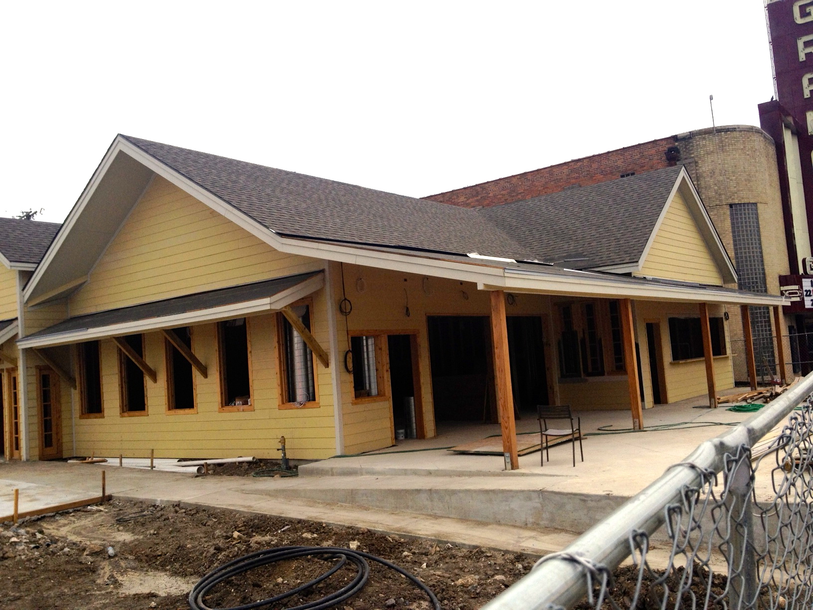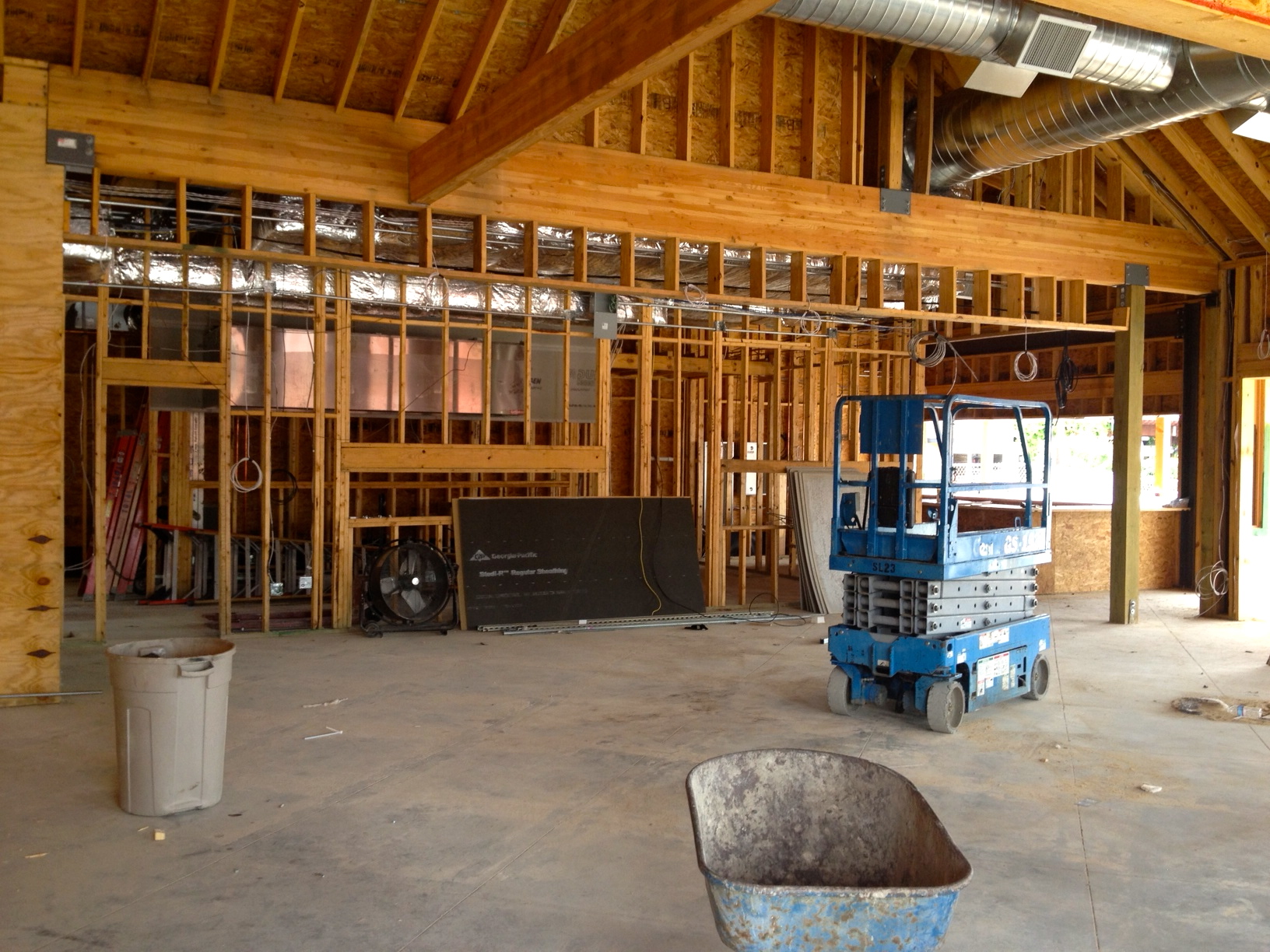 The outside is starting to look like the rendering (minus the rendering’s middle-of-nowhere setting. Is it just me, or does it seem like Snuffer’s is sitting alone on a beach?)