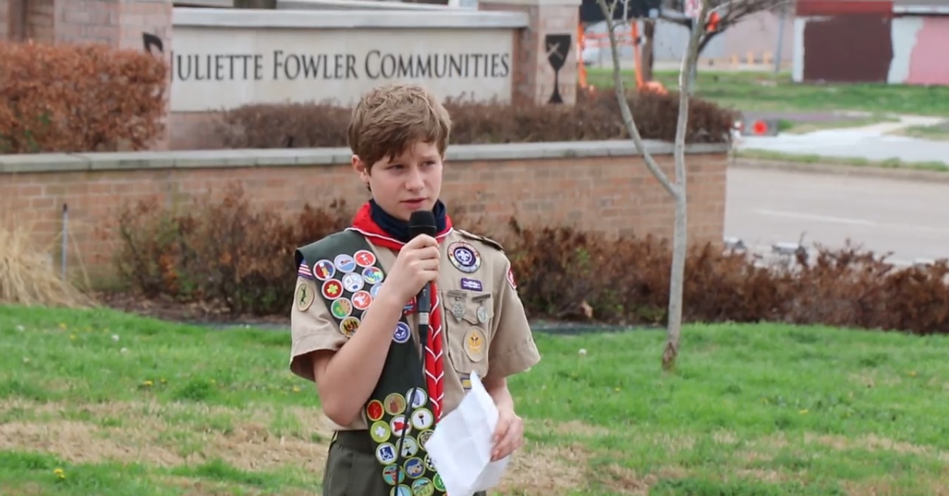 A 14-year-old student raised the American flag on a new flagpole that he built at Juliette Fowler Communities as part of his Eagle Scout project.