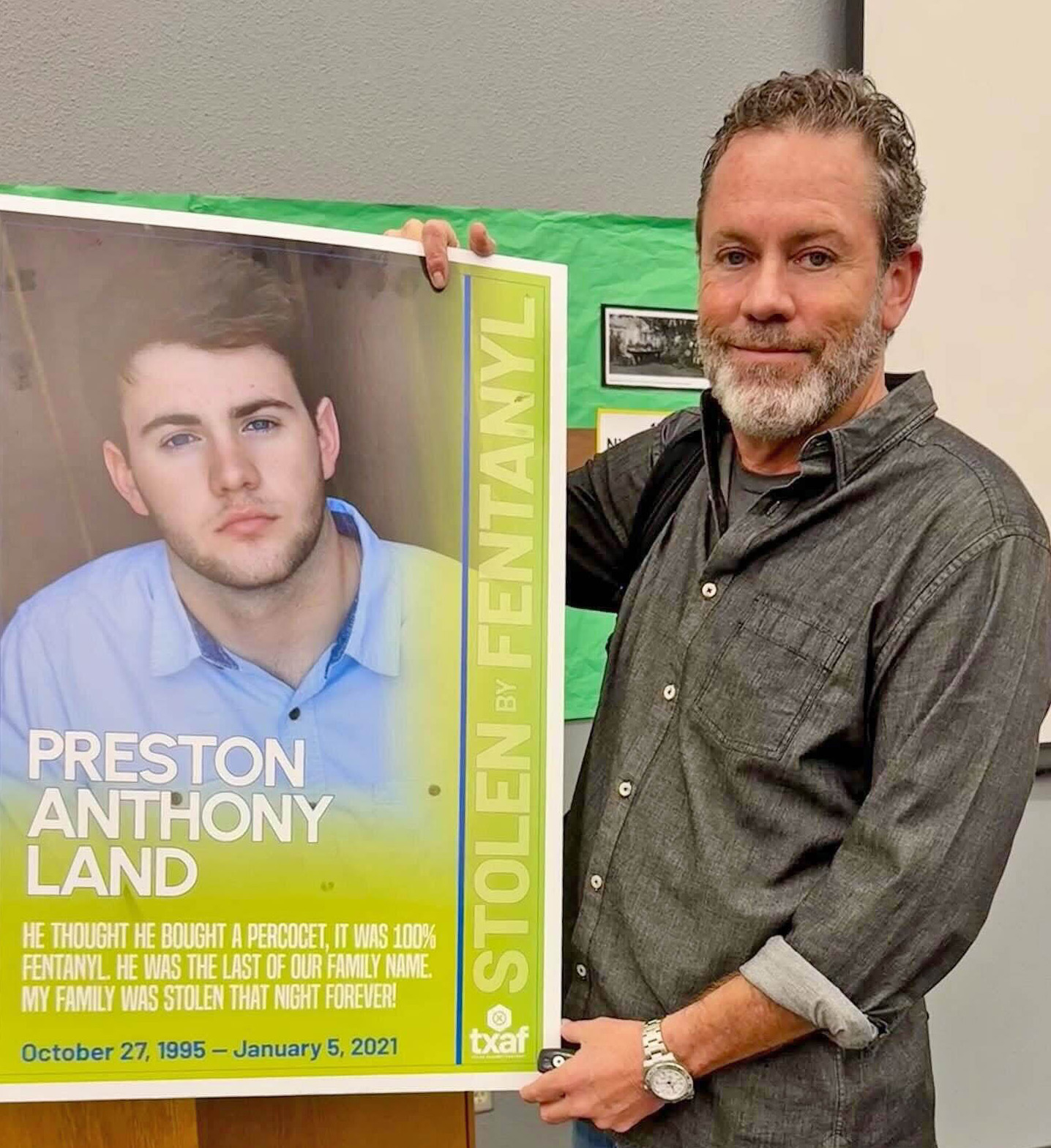 Land currently serves as North Texas Director of TXAF, Texas Against Fentanyl, which works to create awareness in communities. He moved from Dallas to McKinney in 1995 to raise his two sons and was heartbroken ten years later when son Wesley died of medical complications. Preston, a Boyd High School graduate, died of fentanyl poisoning in 2021.