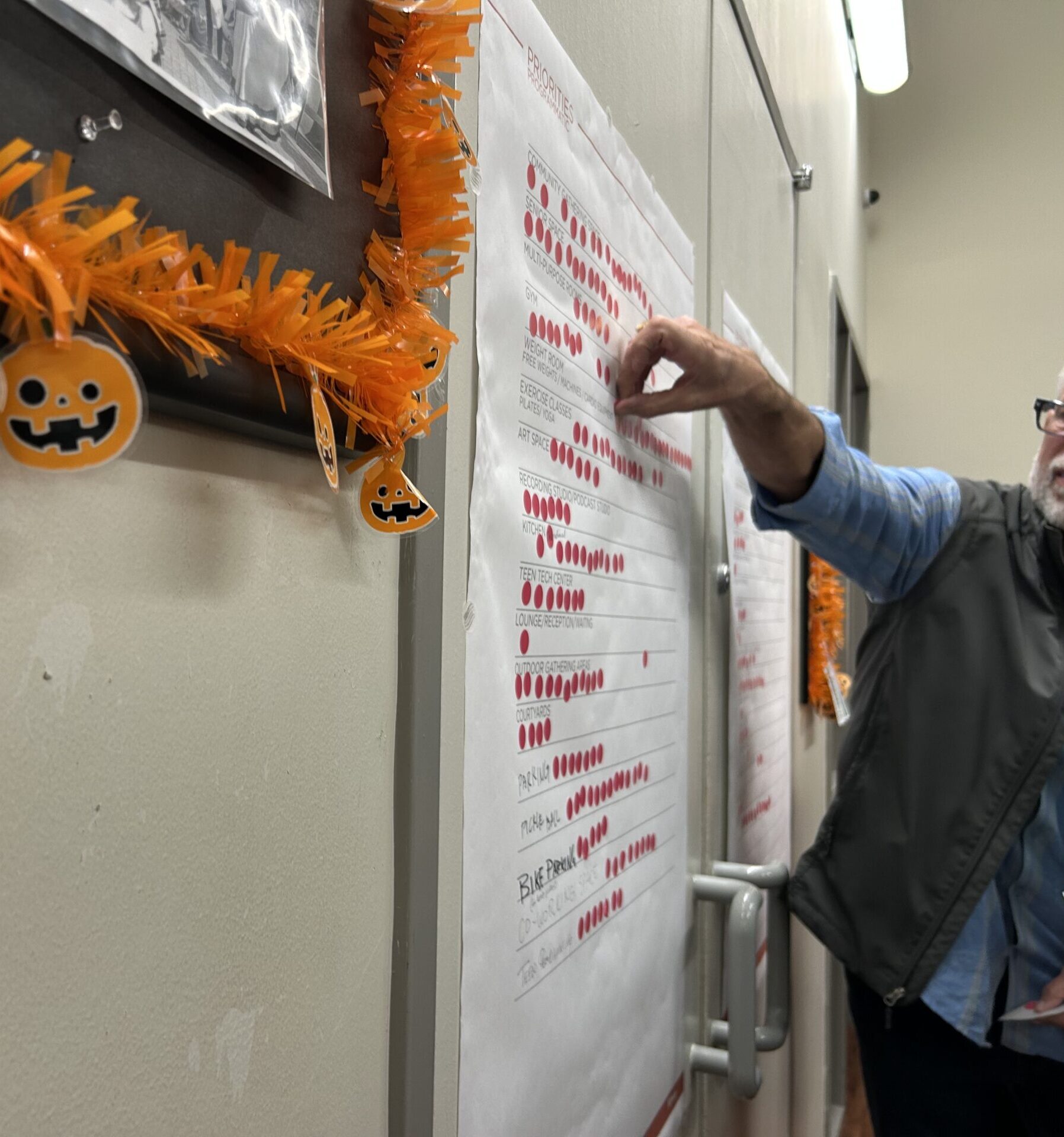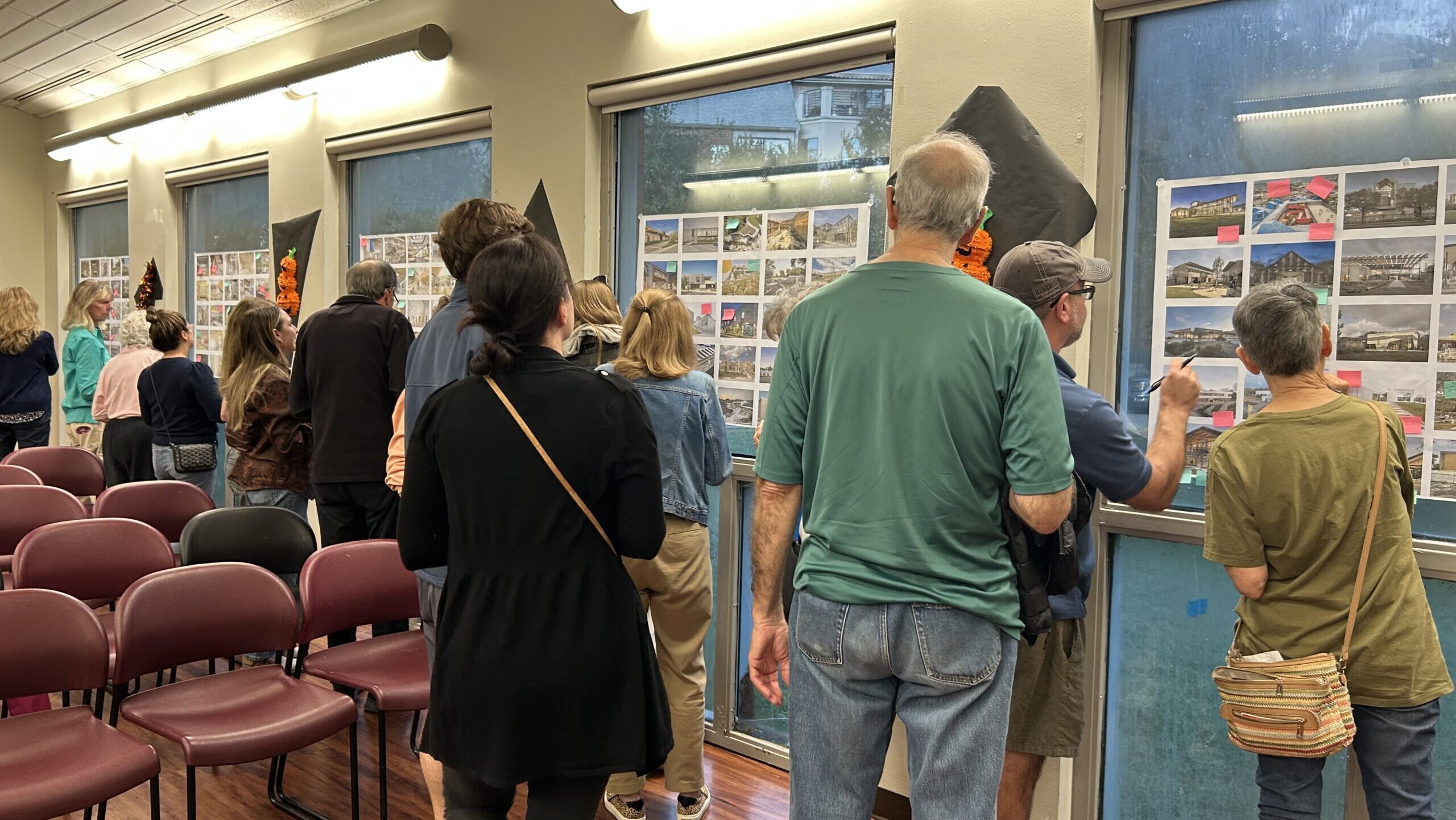 Neighbors who attended the feedback meeting for the new Exall Park Recreation Center were also asked to look at pictures and flag them with a blue/green sticky note if they were in favor of seeing something like that at the new rec center or pink if they were opposed. Photo by Madelyn Edwards.