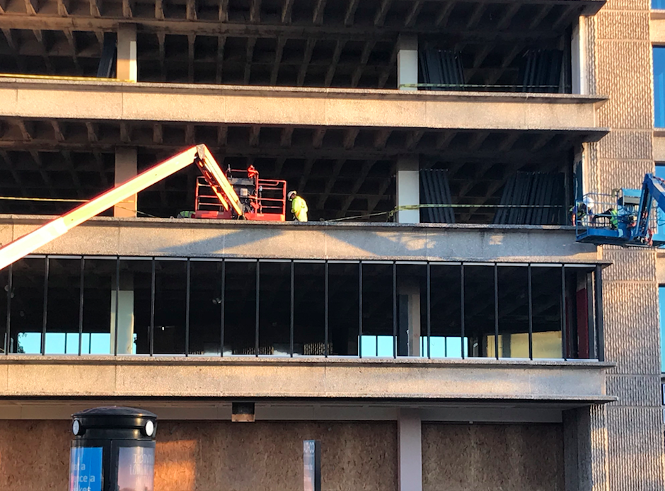 Construction workers are on site with cherry pickers replacing windows on the north side of the building.