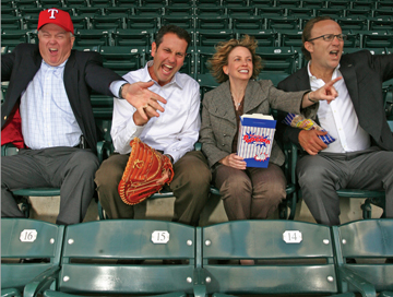 When we last spotted neighborhood resident Kellie Fischer, chief financial officer of the Texas Rangers baseball team and vice president of Hicks Sports Group Inc., she was posing for a May 2009 story in our magazine with other neighborhood residents who help run the team. These days, though, Fischer is mentioned in the press just about every day as one of the people at the center of the Texas Rangers bankruptcy process. Just yesterday, Fischer was being berated by a bankruptcy judge in Fort Worth for one of her answers to his questions. She’ll probably have a lot to talk about at some point, but not until the bankruptcy process ends later this year. Others in the photo include (from left) human resources vice president Terry Turner, assistant general manager Thad Levine, Fischer, and former vice president of ticket sales Dan Fine, who has since gone to work for the Dallas Stars hockey team.