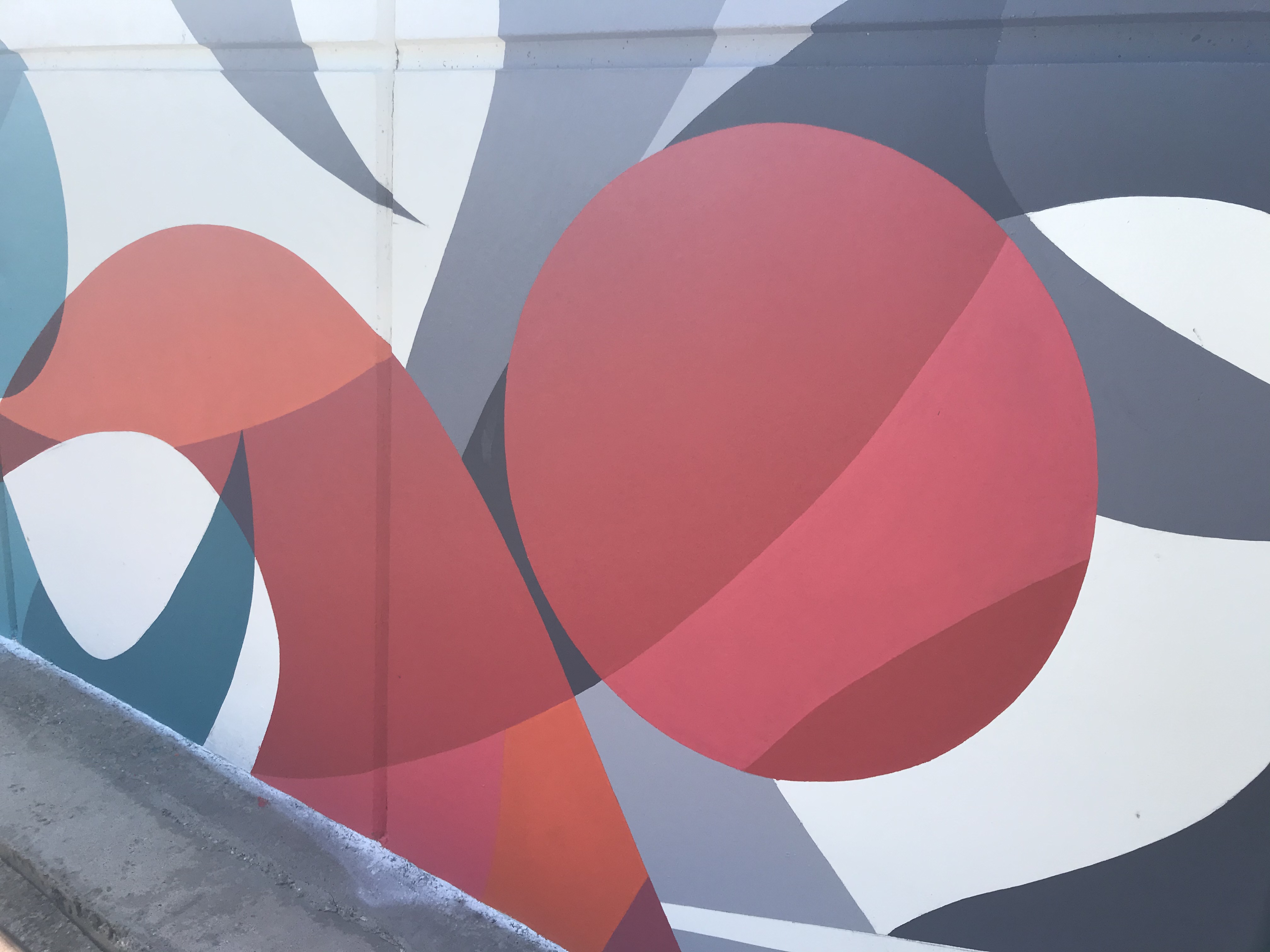 The mural shows several figures that look like they’re running along the trail. The multicolored circles are their heads, and other geometric shapes complete their arms and shoulders, painted in a running motion. “People don’t see it right away, but as it starts to settle, people will eventually pick up on it,” Garrison said.
