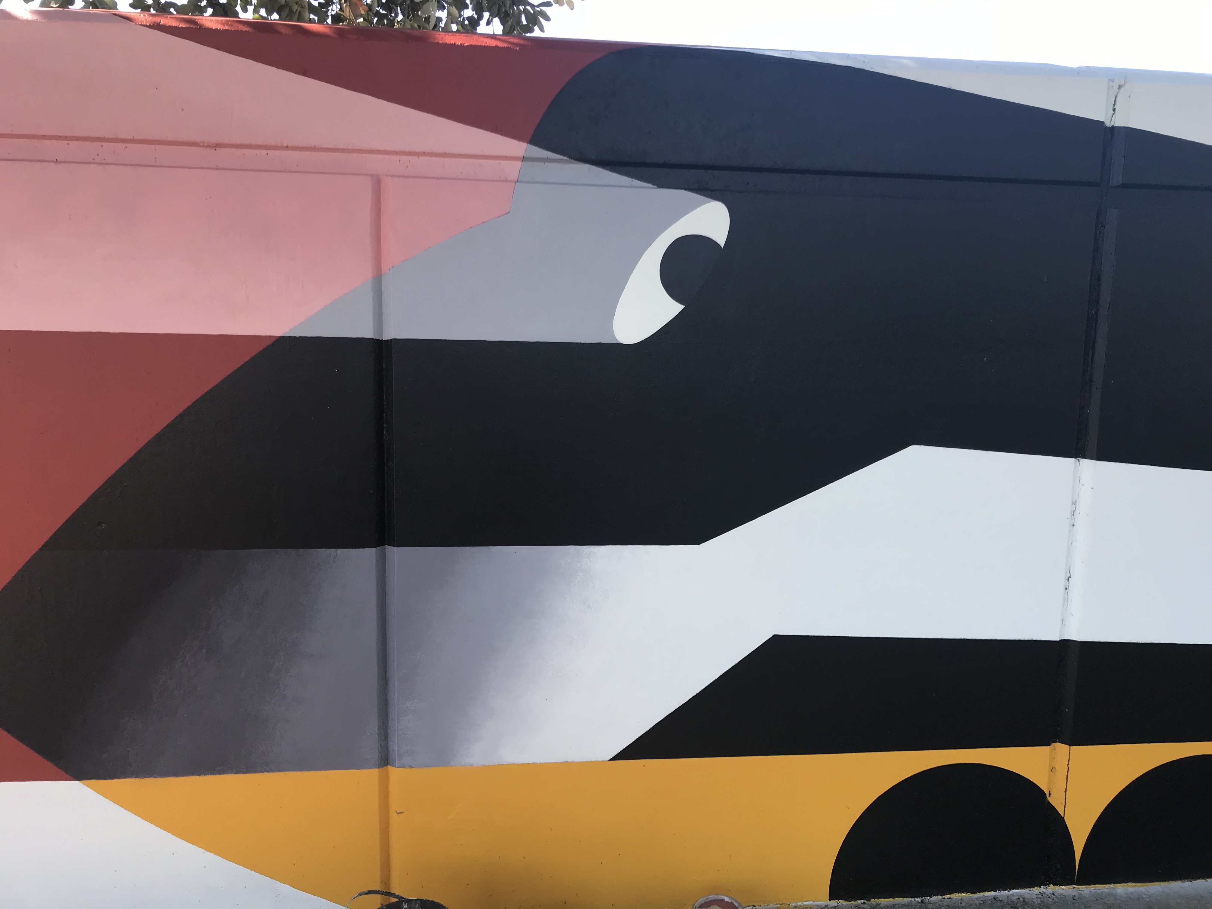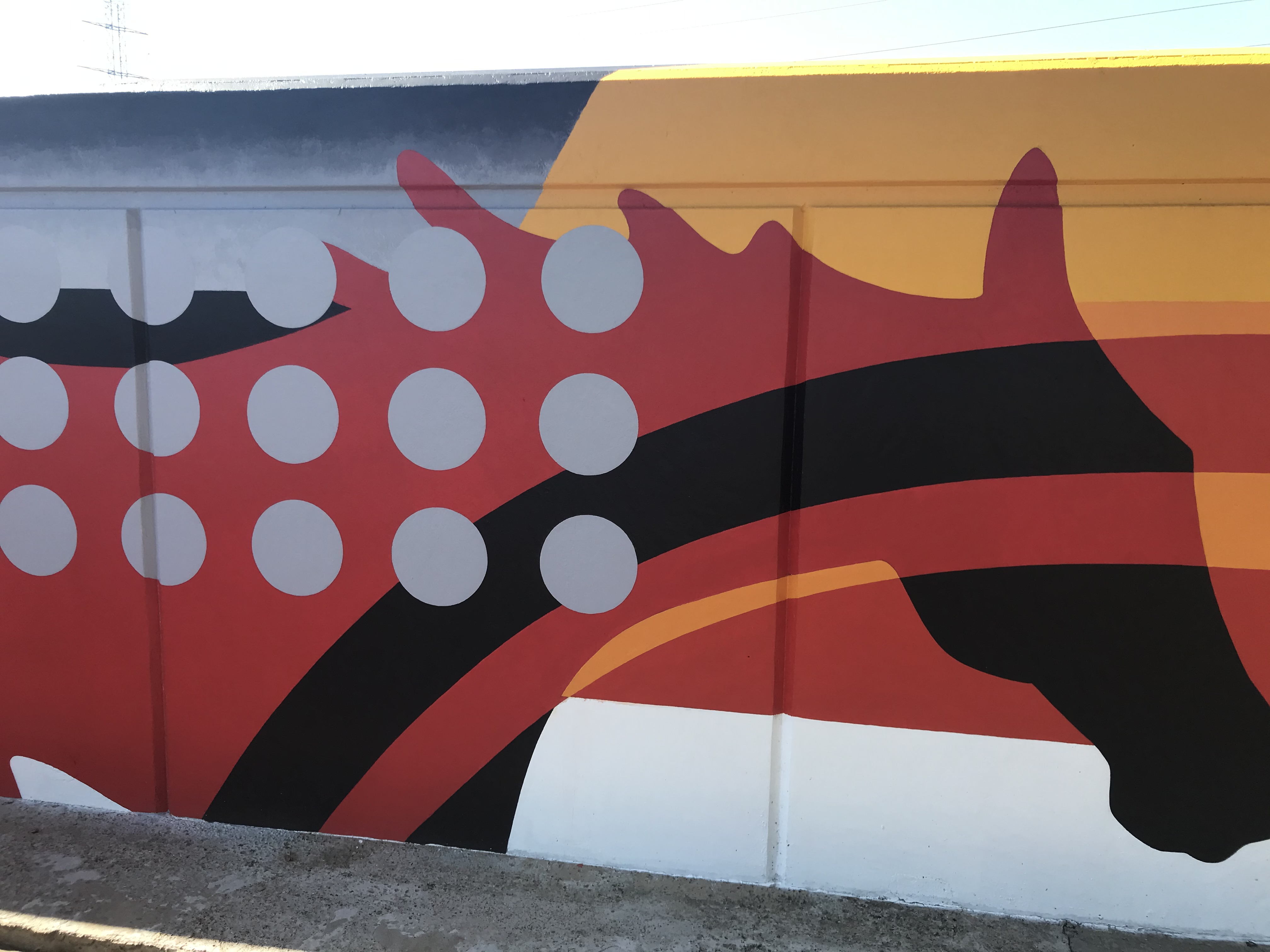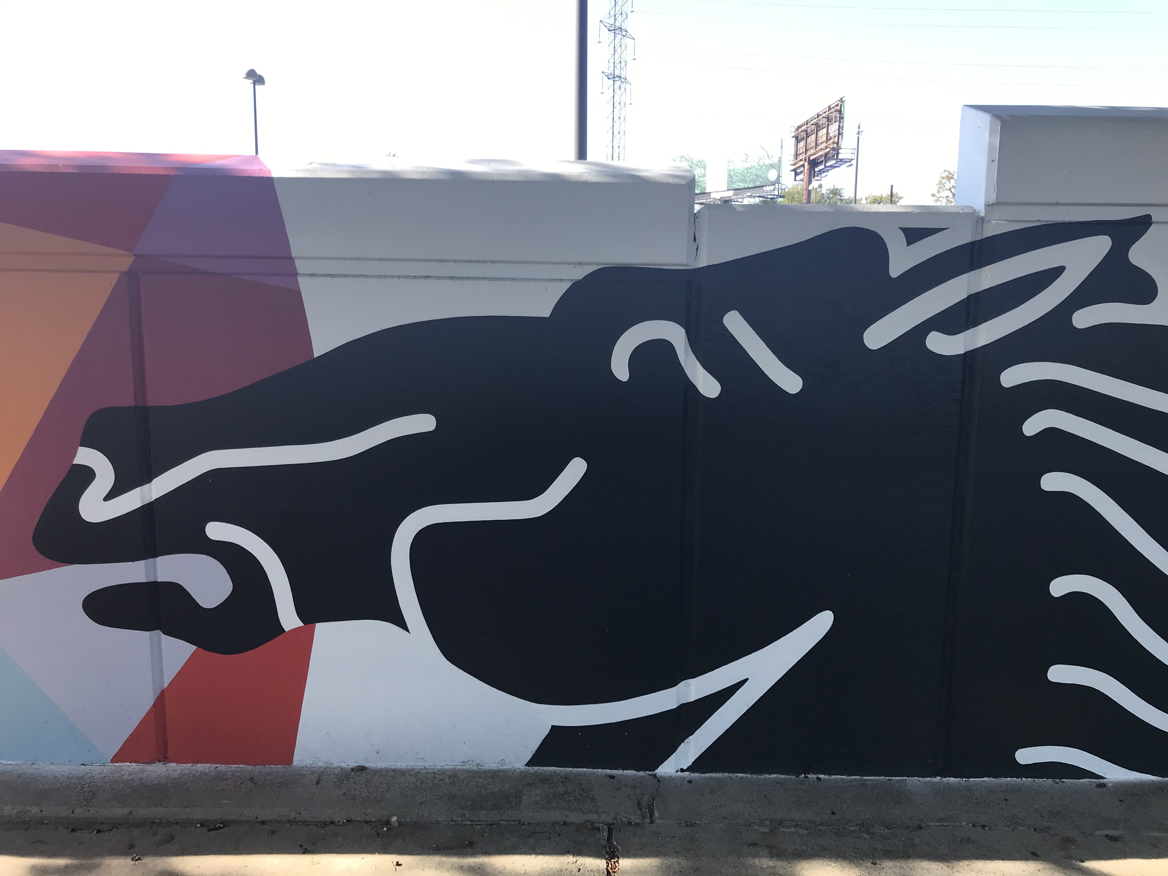 The mural is linear. On the south side of the wall, visitors will see images like the pegasus that reflect Dallas as a whole. As they continue north, they’ll see scenes, such as the DART train, that are specific to the neighborhood. The mural is bookended by two bridges — the Margaret Hunt Hill Bridge on the left and the Mockingbird Pedestrian Bridge on the right.