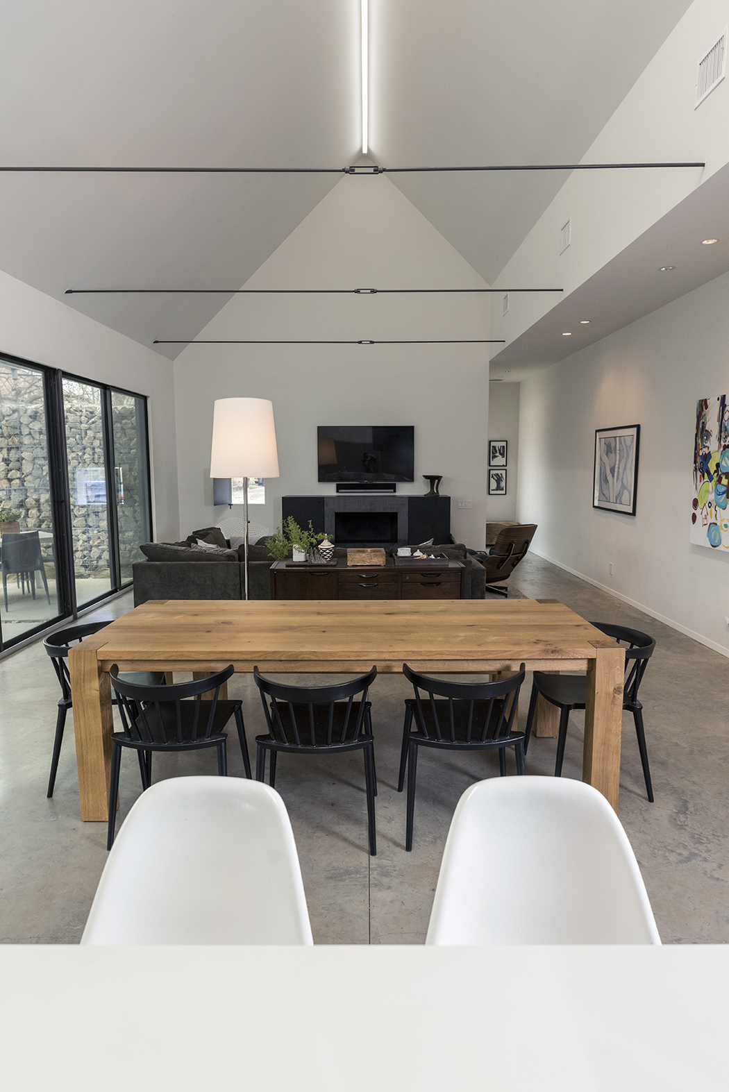 Though the home resembles a prairie dwelling on the outside, the inside is clean and modern. It is bright and welcoming with vaulted ceilings and natural light. The dining, kitchen and living areas are open and flanked on one side by floor-to-ceiling windows that slide open to the pool and yard. The Linders love to entertain, and the common space at the front of the house seamlessly integrates inside and out.