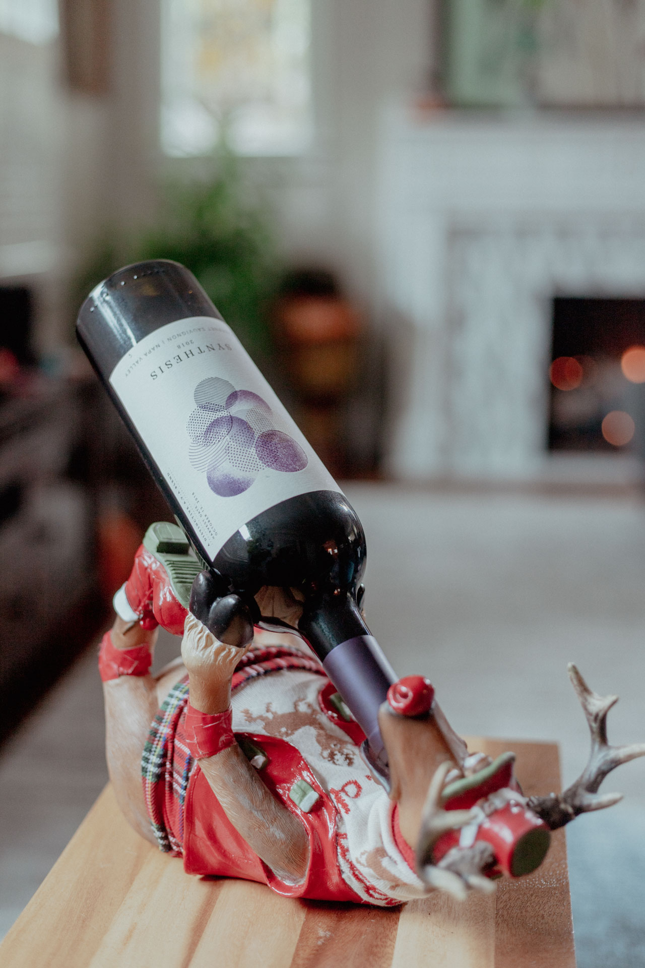 For Hollywood/Santa Monica neighbor Elida Willis and friends, their unusual tradition also involves an object: a gaudy, tacky, wine bottle holder disguised as one of Santa’s reindeer who apparently has indulged in one too many nightcaps after pulling the sleigh all over the world. His eyes appear glassy, his feet are up in the air, and his hooves are ready to grip a bottle of vino. Rudolph needs a drink.
