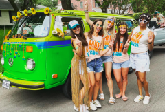 The PTA announced the theme during the Fourth of July parade. Members and their families cruised down Lakewood Boulevard in classic cars, including a 1967 Jeep Kaiser M715 and a 1973 Volkswagen bus. They flashed peace signs as Creedence Clearwater Revival and Jimi Hendrix blared from the bus.