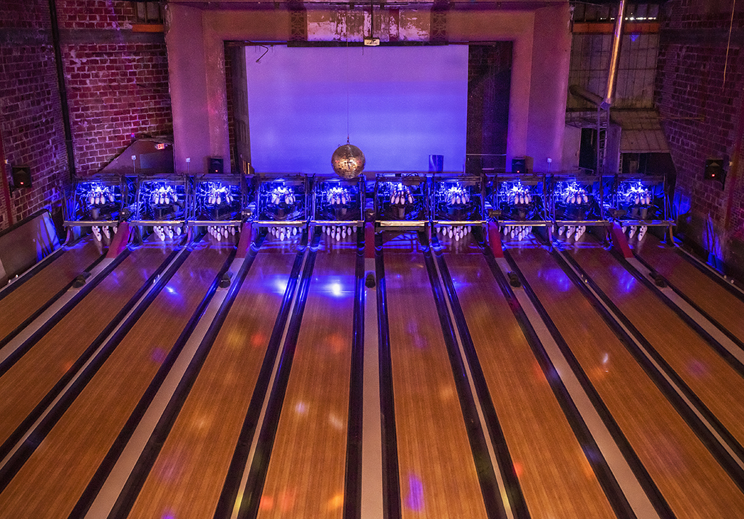 In the bowling alley, art deco fixtures mix with a steampunk style, which combines Victorian era romanticism with scientific elements from the Industrial Revolution. The roof remains exposed, revealing the woodwork and steel beams, and exposed bowling machines allow customers to see the mechanical operation of resetting pins.