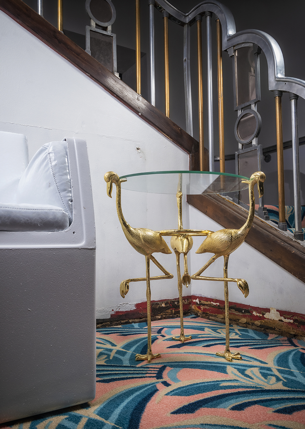 The Spiveys kept the original bathroom tile and all the original doors, which they returned to their original color. The mirror shaped like a grand piano is also staying in the lobby. The handrail that has graced the staircase for decades remains, albeit with a modern upgrade. When Craig learned that neon lights once shone under the railing, he mounted his own set of LED bulbs.