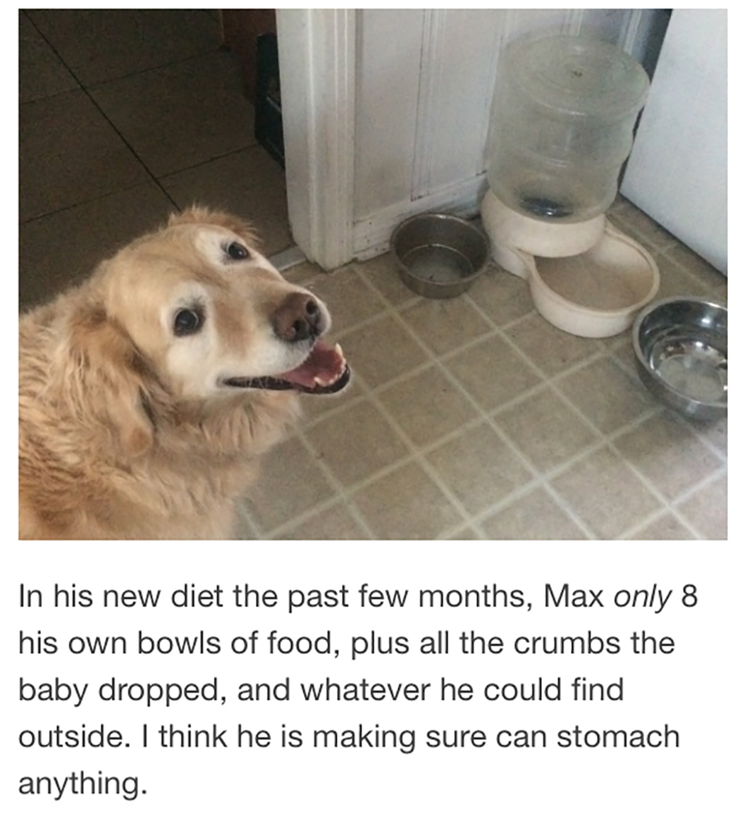 Max can be greedy. Littlefield writes that the 7-year-old retriever always wants more love and attention — and especially food. While away from home on puppy play dates, Max doesn’t hesitate to eat another dog’s food. But thanks to Lucy, he’s slowly learning to share.