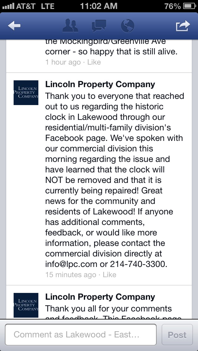 After Lincoln Property Company had the clock in the Lakewood Shopping Center taken down yesterday, the Lakewood community took to Facebook with an outpouring of concerned comments on Lincoln’s residential/multi-family Facebook page.