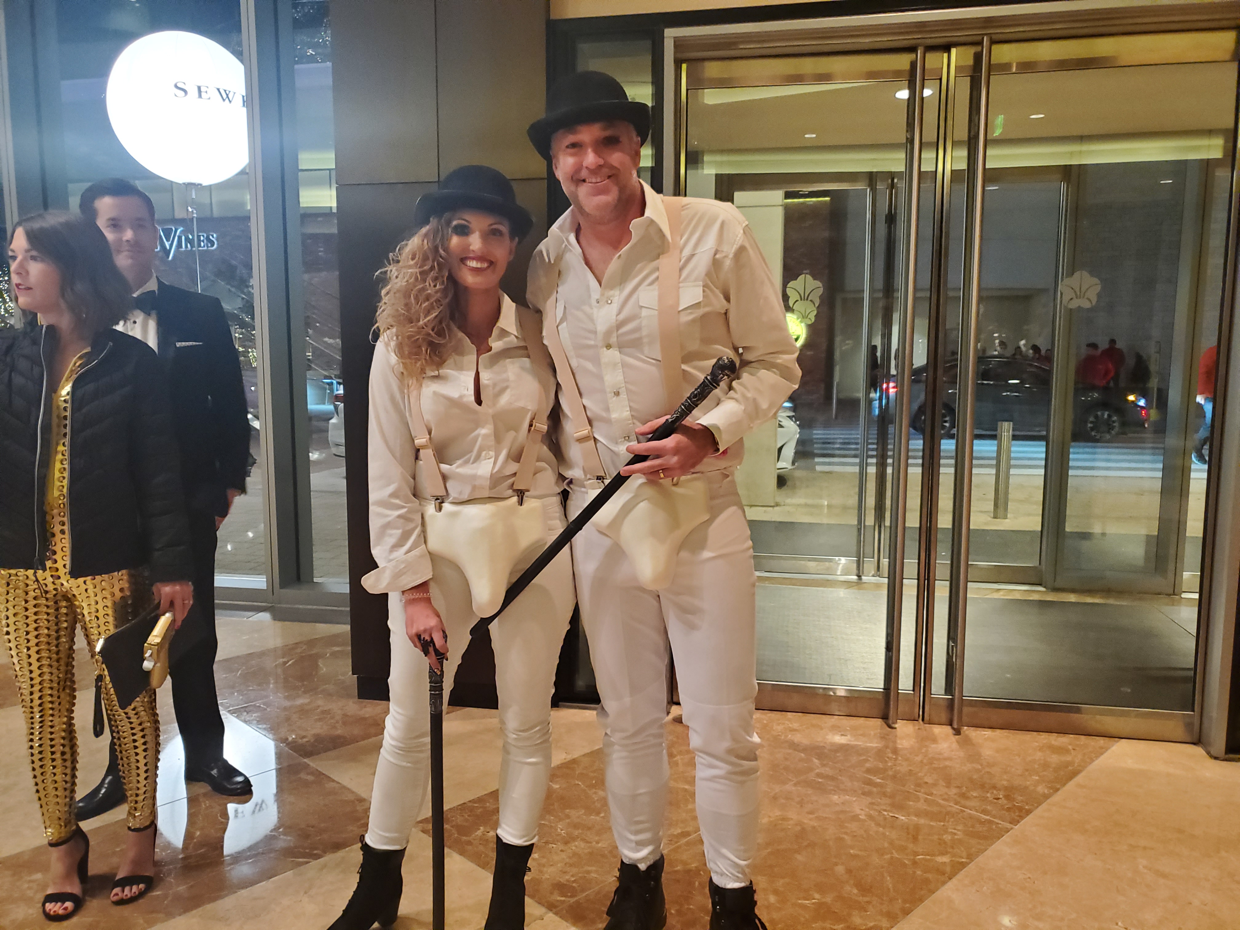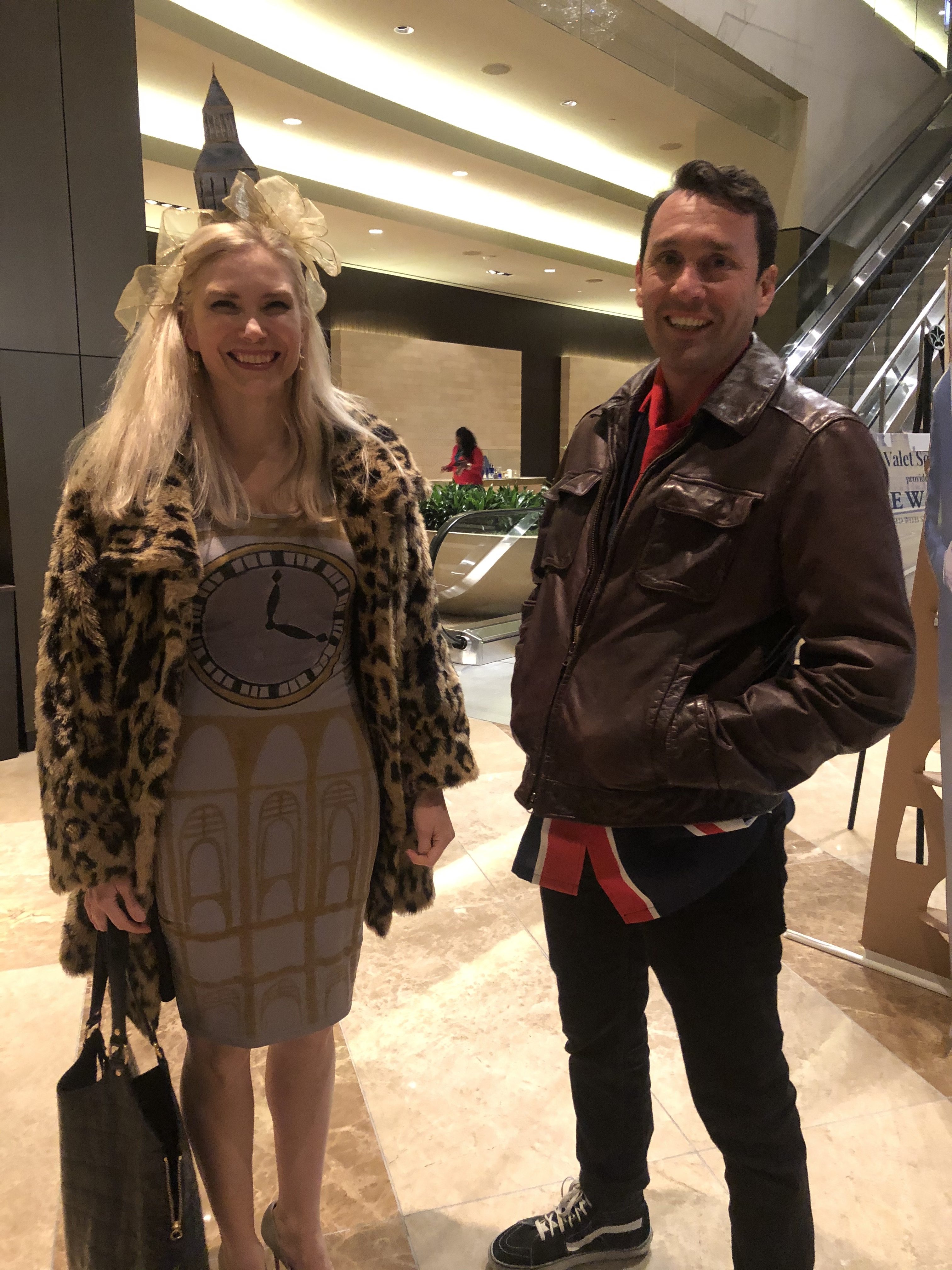 Pam Hockart and Will Nessle dressed as the Elizabeth Tower, home to Big Ben, and the Union Jack flag. Hockart painted the dress and made the headband for the event.