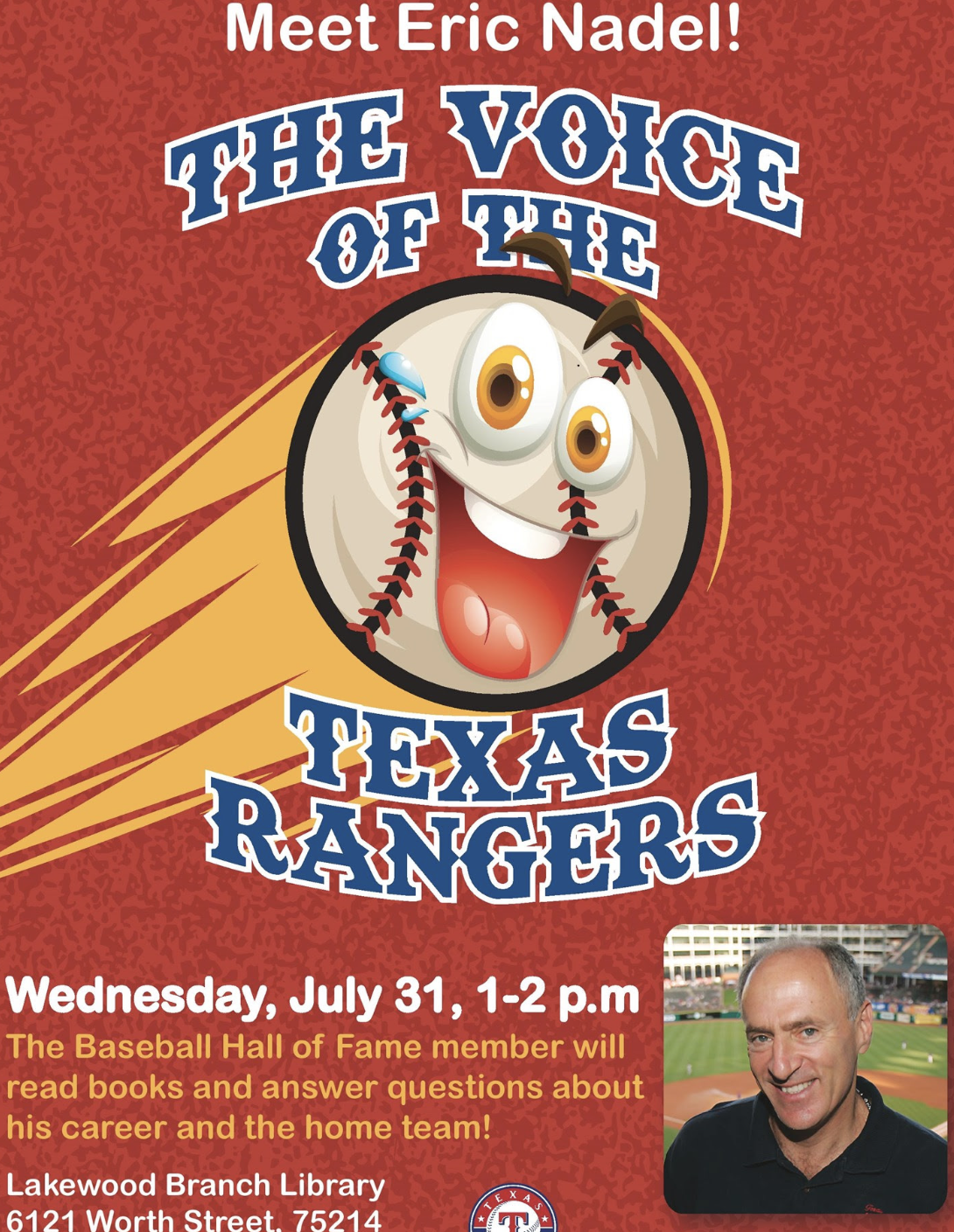 Change up your summer routine and meet renown sports announcer and radio broadcaster for the Texas Rangers, Eric Nadel. Neighbors can meet Nadel from 1-2 p.m. July 31 at the Lakewood Branch Library.