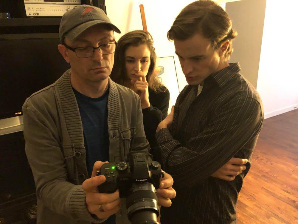 Cinematographer Daniel Frank (left) and Harding (right) on the set of 13 Tracks to Frighten Agatha Black (2022)