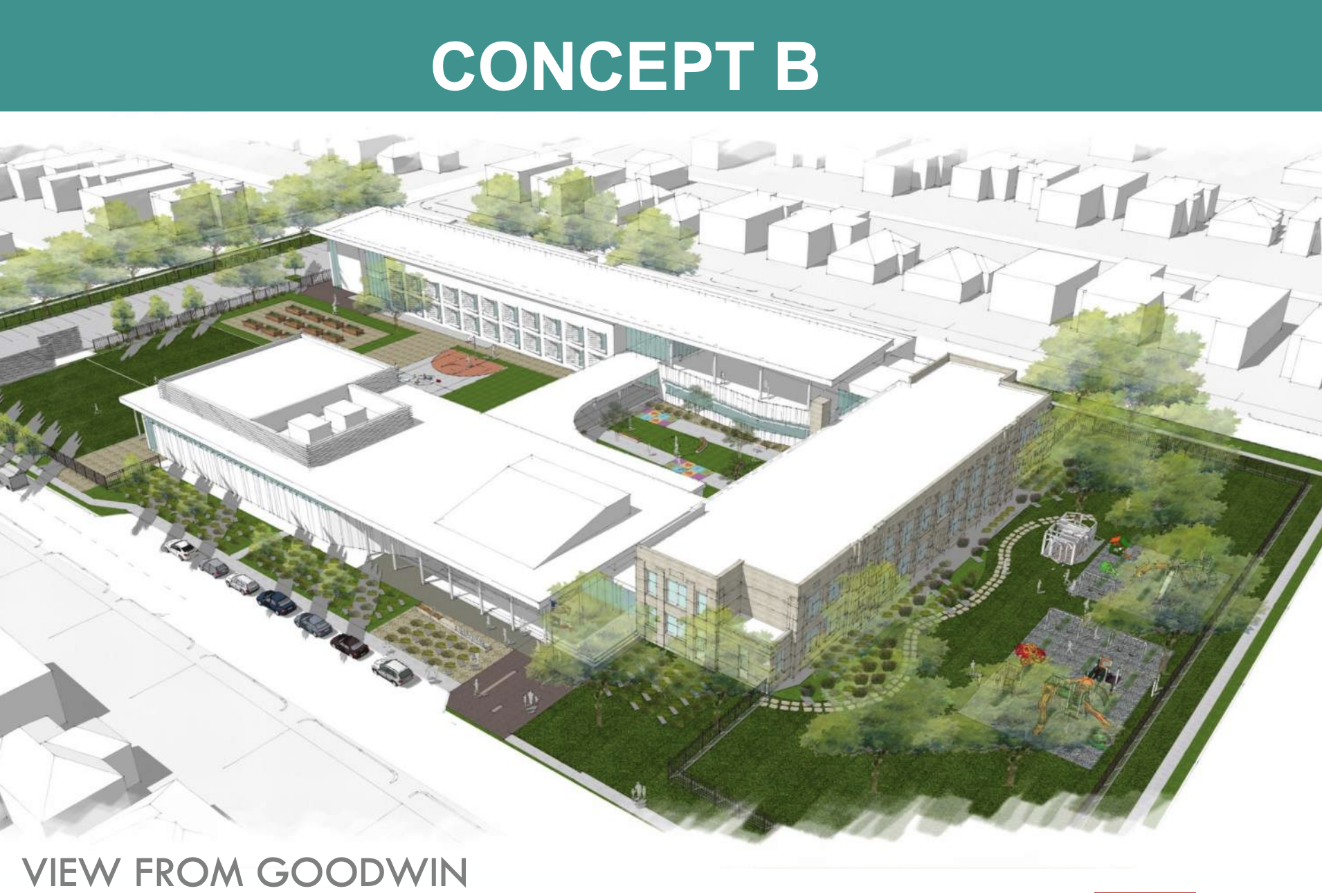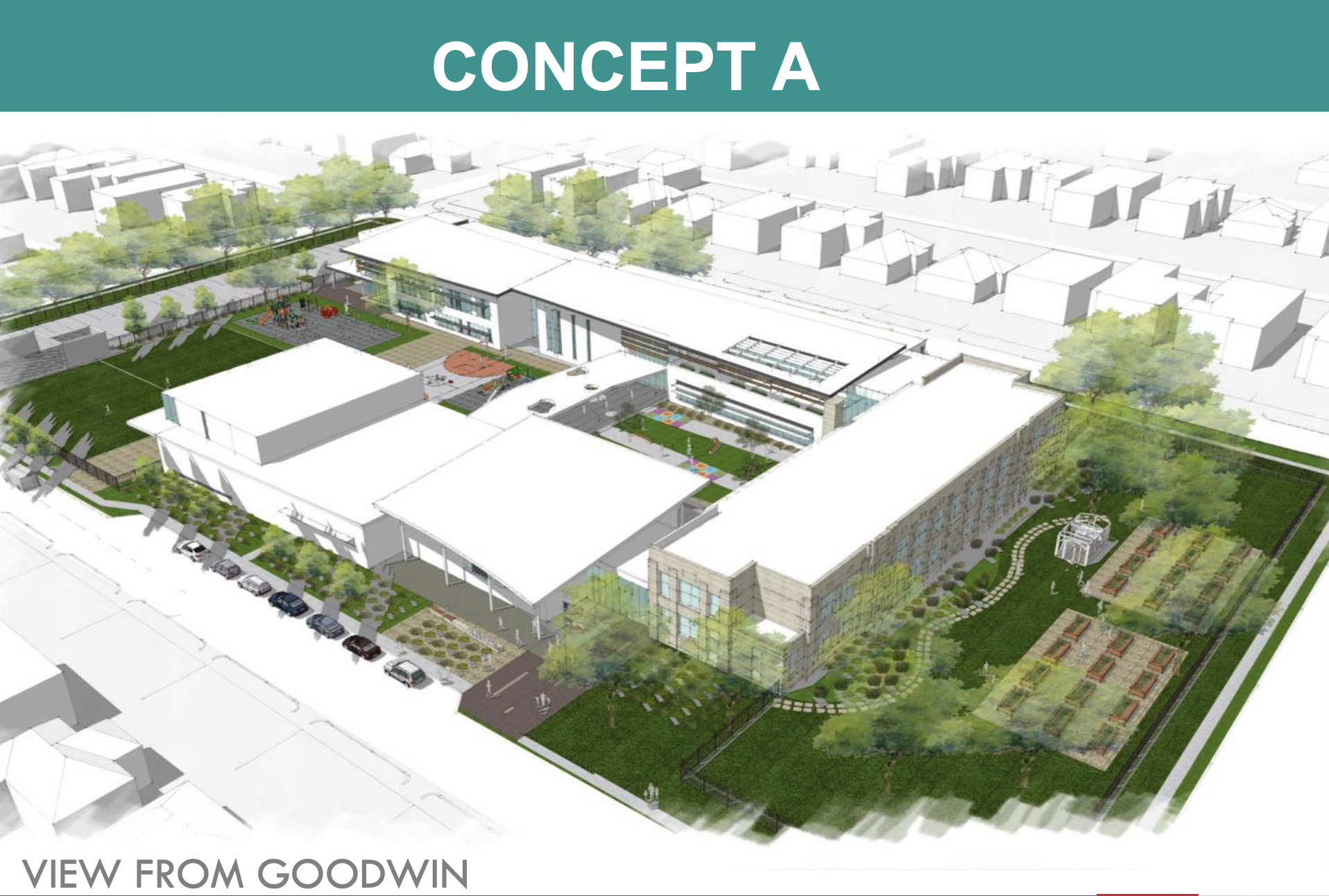 One main difference between the two concepts is the placement of the garden and playground areas. Many neighbors preferred the playgrounds to be together and more centrally located on the campus.