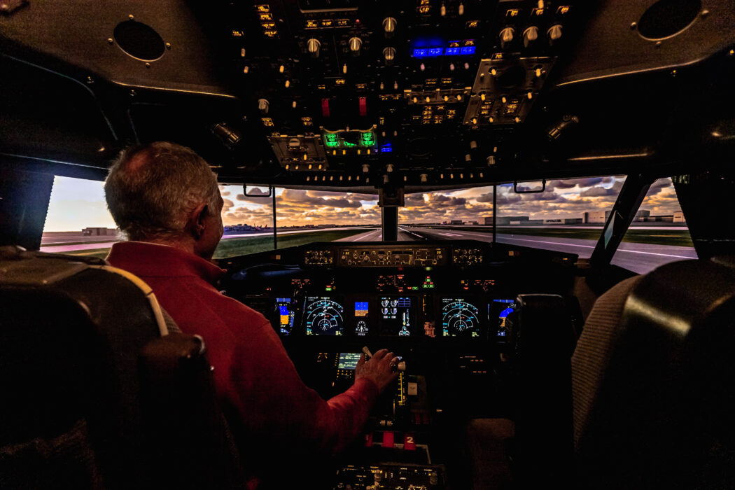 The existing simulator is not the first iteration of Sayre’s work, but it’s the most thorough he’s ever had. The cockpit sits on a wheeled platform Sayre built. He commissioned a Canadian company to build the shell of the cockpit, and he bought component parts of the mock 737 from different companies.