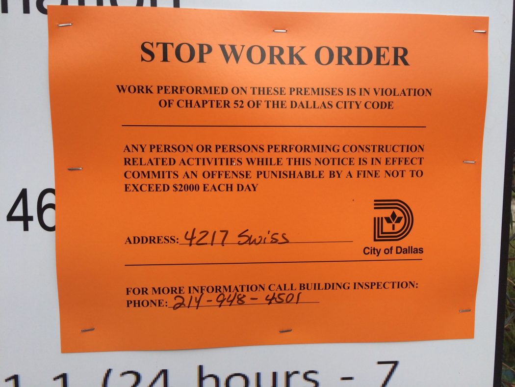 The construction at 4217 Swiss Ave. is stopped for now.