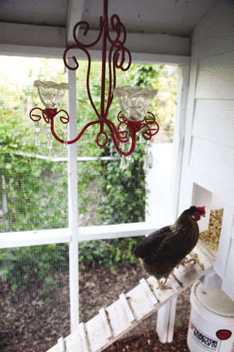 The coop features a window complete with a flower box, a shingled roof, and even a little red chandelier. But don’t be fooled by the delicate touches; their chicken haven also has several top-notch security measures, which is important since the Auensens’ backyard backs up to a creek.