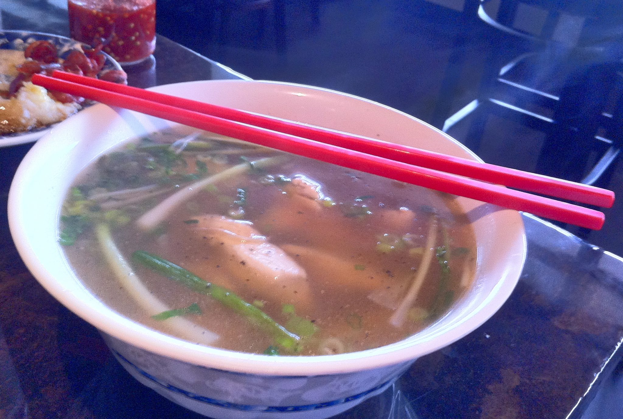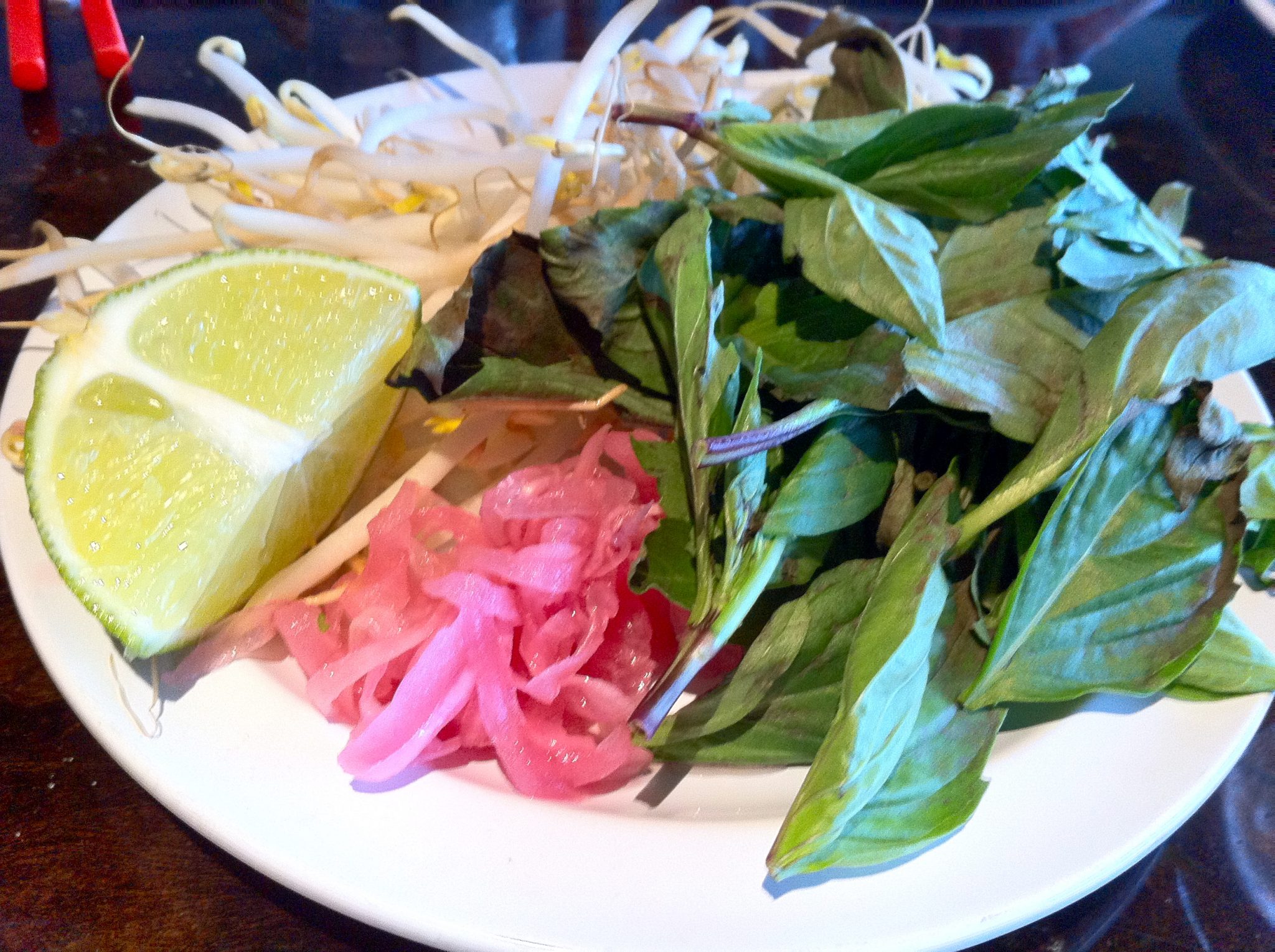 The chicken pho did not come out in two seconds, indicating that it was made to order. A sort of pho-salad-bar had offerings of basil leaves, pickled onions, bean sprouts, and lime to dress up the noodle soup. The broth was flavorful and had an abundance of noodles and green onions to fill up an empty stomach.