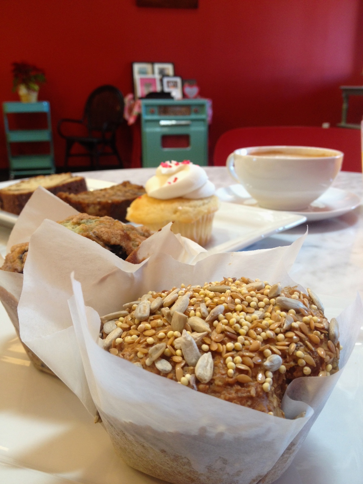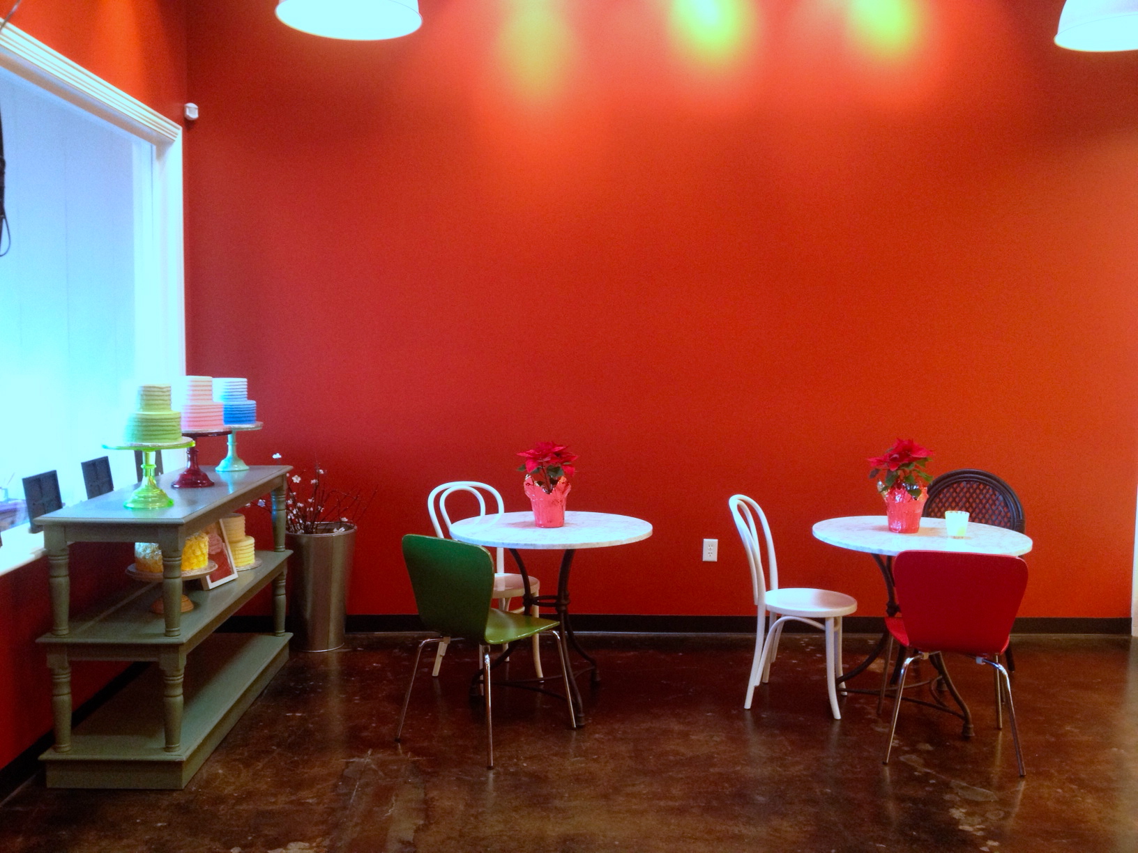 The quaint location is reminiscent of the original space they left behind just a few blocks down the road, which Unrefined Bakery nabbed as soon as Muns and her team packed up. The new space is defined by bold red walls, offset by softer pink and green accents, giving it the same cozy feel as before — only it’s bigger. Much bigger. There’s room in the front for guests to hang out at one of the tables, or they can walk back and peek over a half-wall into the kitchen, to watch the bakers spin their sugary magic.
