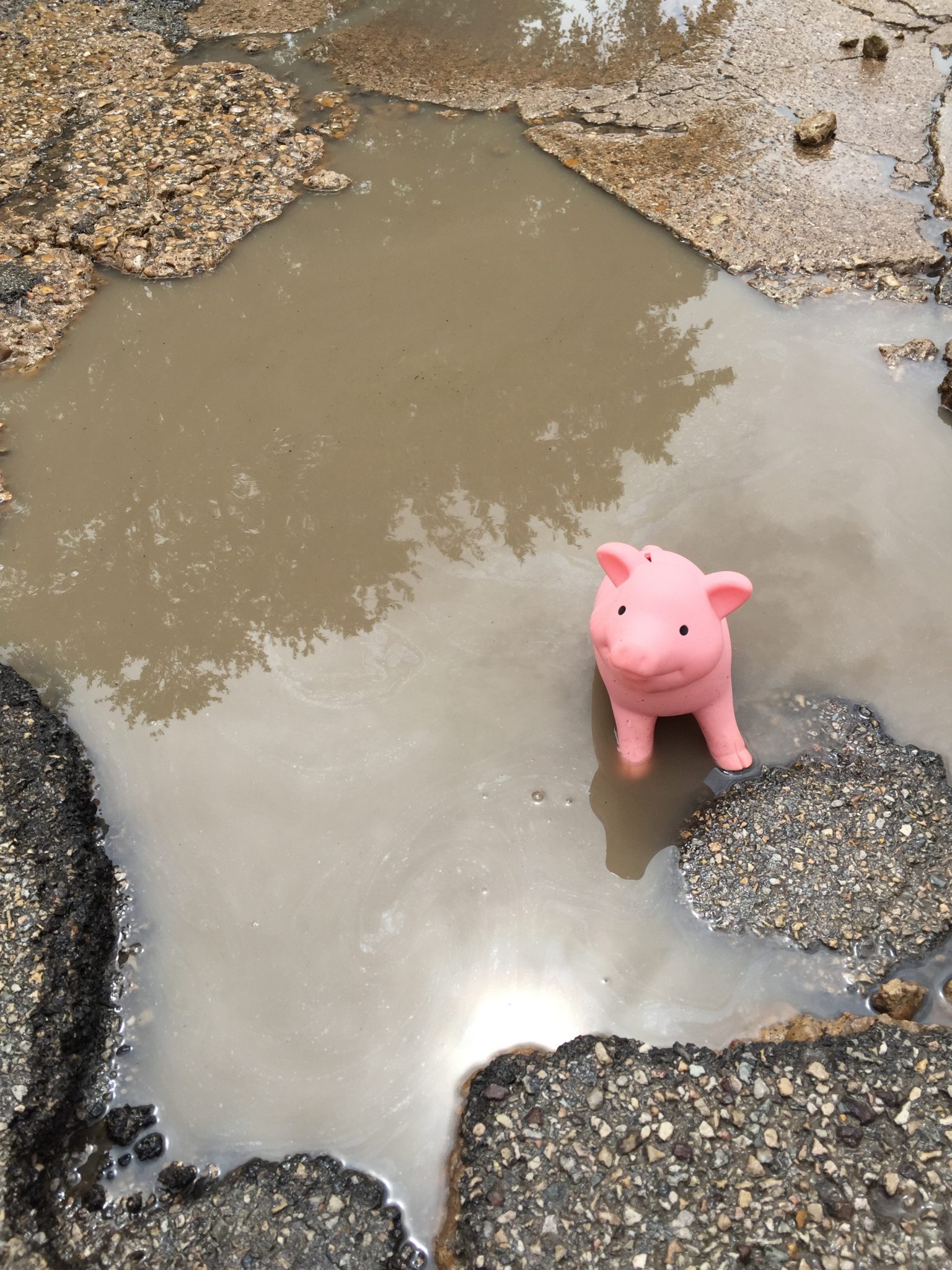 To give you a better perspective, check out the photo at the end of this post. In it, you’ll see Porky still in the pothole pictured above, but with a view that takes in more of the street — and more potholes. And when considering the pothole sizes, remember that Porky lying flat is about the size of a piece of paper.