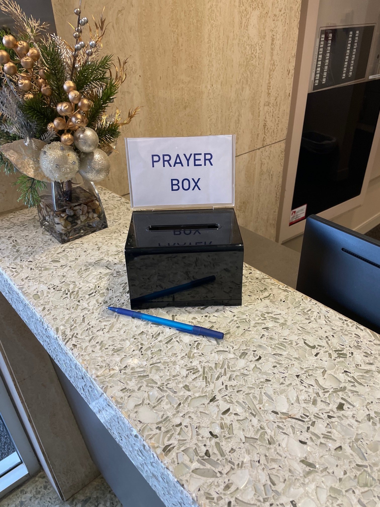 A prayer box at the reception desk in Lakewood Towers.