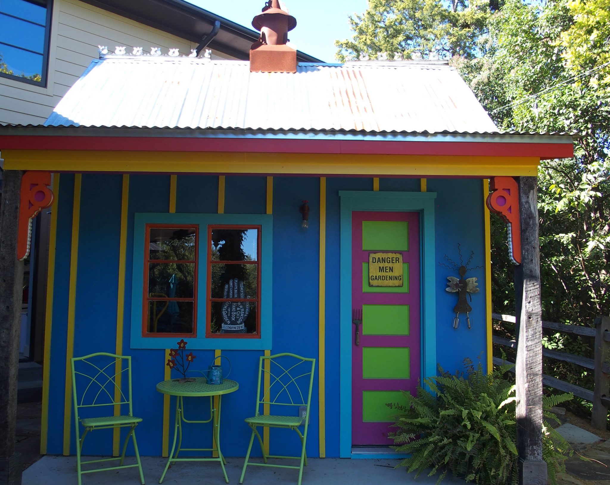 A fire pit is on the bottom level, and on the top, a waterfall cascades into a swimming pool that looks more like a pond. To the left of the pool sits a multicolored garden shed. Push on the old, rusty rake that serves as a door handle and enter the space filled with gardening tools, bags of soil and antique birdhouses.