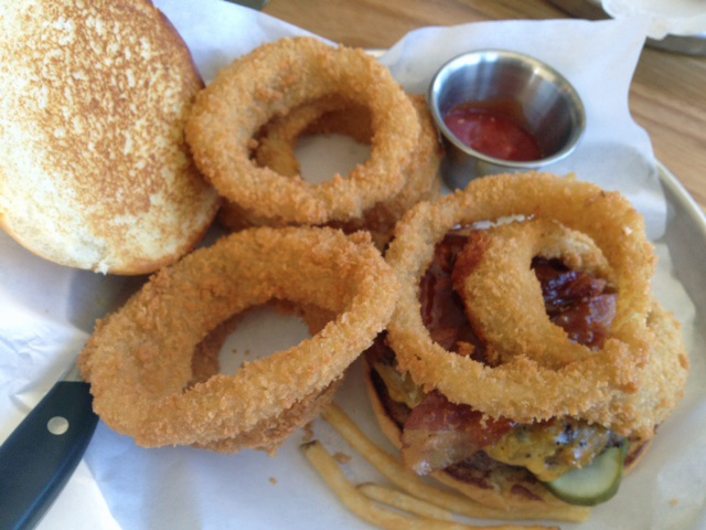 My hubby had the Front Porch, Grub’s standard house burger, and proclaimed it juicy and delicious ($6). His fries were crisp and thin, almost shoestring. One home-from-college son loved his Guacapotle burger, topped with chipotle aioli, guac and an added fried egg ($7.50 plus a buck for the egg). Our other collegiate returner termed his Lockhart Legend, complete with Applewood smoked bacon, Dr. Pepper barbecue sauce and Shiner Bock battered onion rings, “legit” ($7.75). I opted for the Burger of the Sea, Ahi tuna with sprouts, arugula, pickled ginger and wasabi-teriyaki dressing ($11). Yum. (I wiped out all that healthy ordering with a decadent salted caramel shake, one of several don’t-miss flavors.) You can view Grub’s full food menu here.