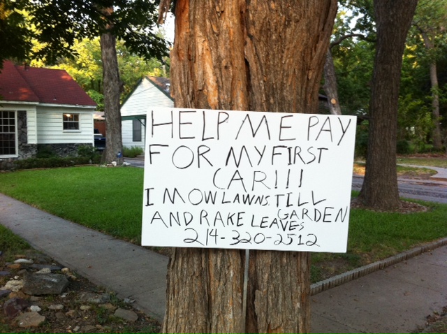 An innovative Hollywood Heights youth wants to earn money to pay for his first car (if it’s the one in the driveway, it is a sweet pale-yellow ’65 Ford Mustang). He’s prepared to mow lawns, till gardens and rake leaves. I hope someone has told this kid about Craigslist. For now, hopefully this will garner him a gig or two. Thanks to reader B.A. Norrgard for sending it in.