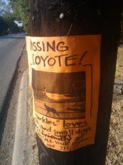 Second, an unconventional coyote hunter has posted “Missing Coyote” signs around the neighborhood, I suppose in an effort to warn residents about the animals’ (“Sparkles”) hunger for cats and small dogs. The sign encourages anyone who has seen a coyote to call our city council representative or 3-1-1. Thanks to White Rock Running Co-op co-member Matthew Williams for telling me about these.