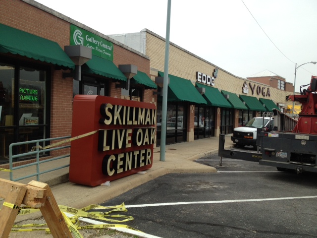 Owners of the shopping center at Skillman and Live Oak were having the center’s decades-old sign replaced this morning.