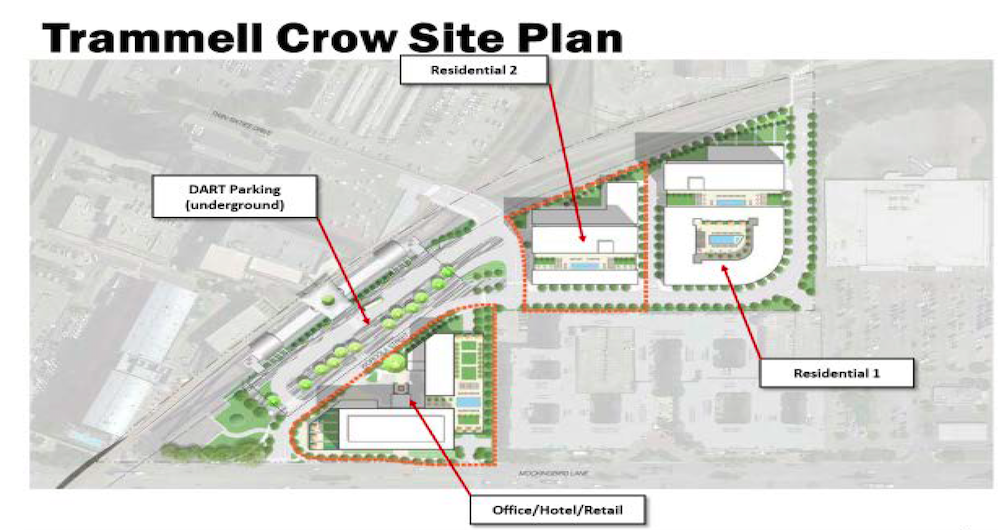 A site plan for commercial and residential development at DART’s SMU/Mockingbird Station. (Rendering courtesy of DART.)