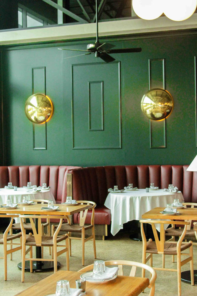 They sourced an assortment of secondhand tabletops, sanding them down in their Keller home. That’s why the tables are all different shapes and sizes. There are a few Restoration Hardware pieces scattered throughout the restaurant. A deep green, something between emerald and forest, coats the walls and juxtaposes the deep burgundy booths and the light wood.