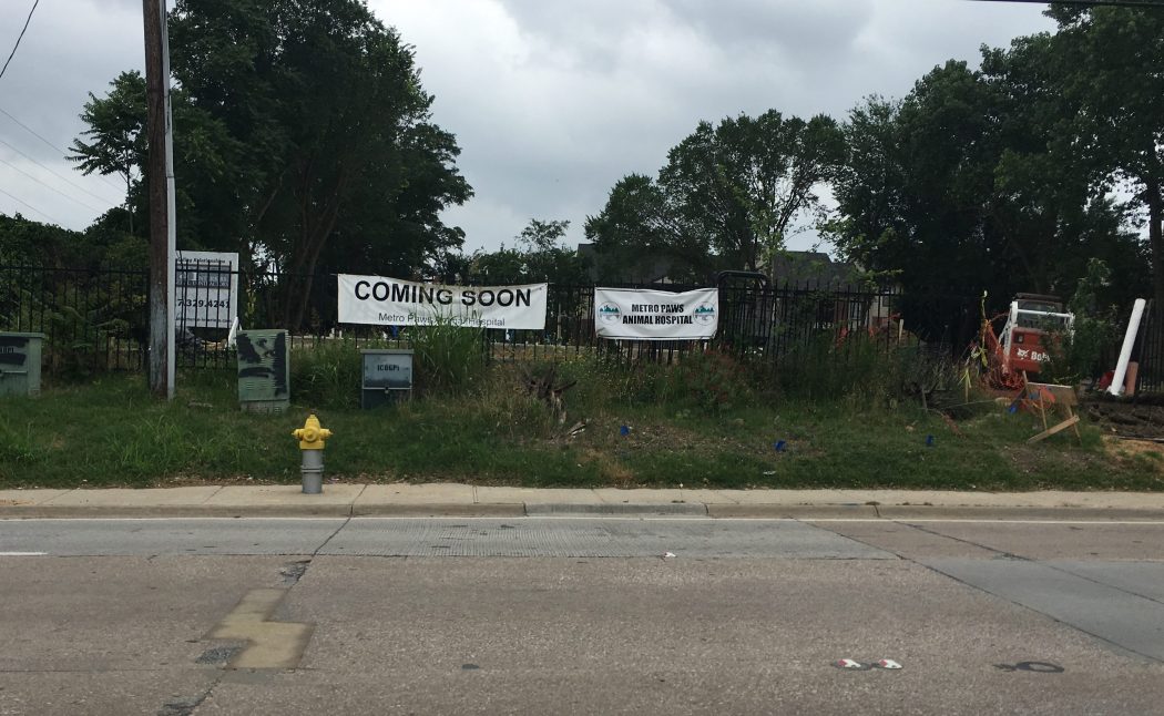 The site hosted the Promise of Peace Garden before it moved down the road. Metro Paws bought the property two years ago when looking for a spot to open a new clinic. It’s “an area in need of veterinary care” and “will give some of our current clients a closer option,” says office manager Trey Knowles. Metro Paws opened its Skillman-Live Oak location in 2006 followed by a second location in Oak Cliff in 2012. This will be its third. The new building will have two stories with a grass-covered terrace on the second story where smaller dogs boarding at the clinic can be exercised. Bigger dogs will have an fenced outdoor area for exercise. The property, which can be accessed via the Santa Fe Trail, is large enough that “we are looking potentially at a dog park for our clients’ use,” Knowles says. “We’re hoping to develop that in final plans.” The clinic should be open in late November or early December.