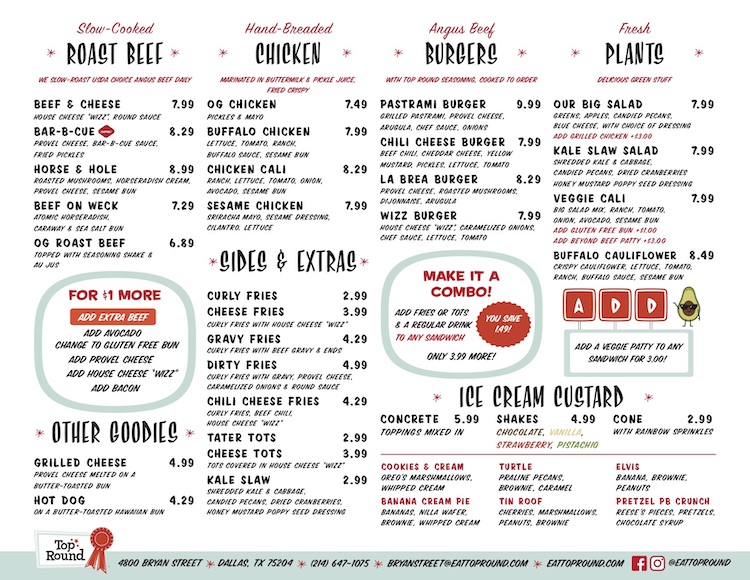 Top Round specializes in roast beef sandwiches topped with fried pickles or cheese whiz, but the eatery offers vegetarian, vegan and gluten-free options, such as the buffalo cauliflower burger. There are also dessert items like banana cream pie and custard.