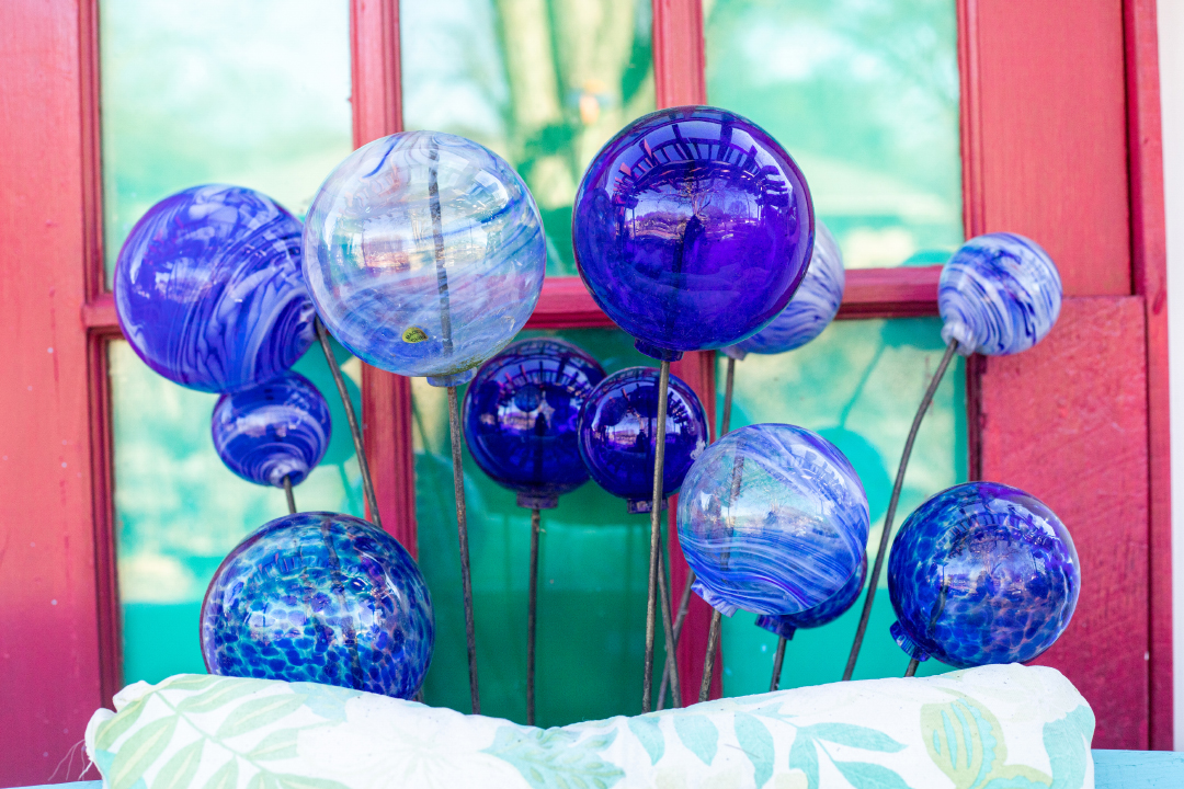 The focal point of this “room” for many who pass by is the charming little seating area, complete with a Caribbean-blue swing that conjures Key West breezes. It is essentially a room within a room, as the swing is framed by sections of picket fence on either side and backed by a discarded/repurposed door and pair of shutters. Potted plants and a blue and white outdoor rug complete the cozy space.