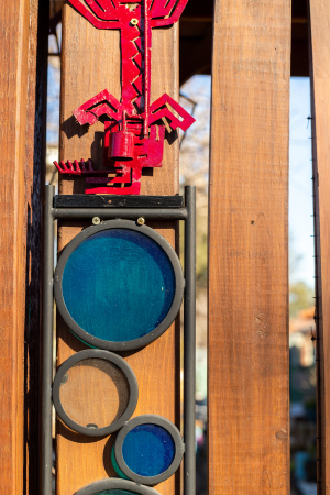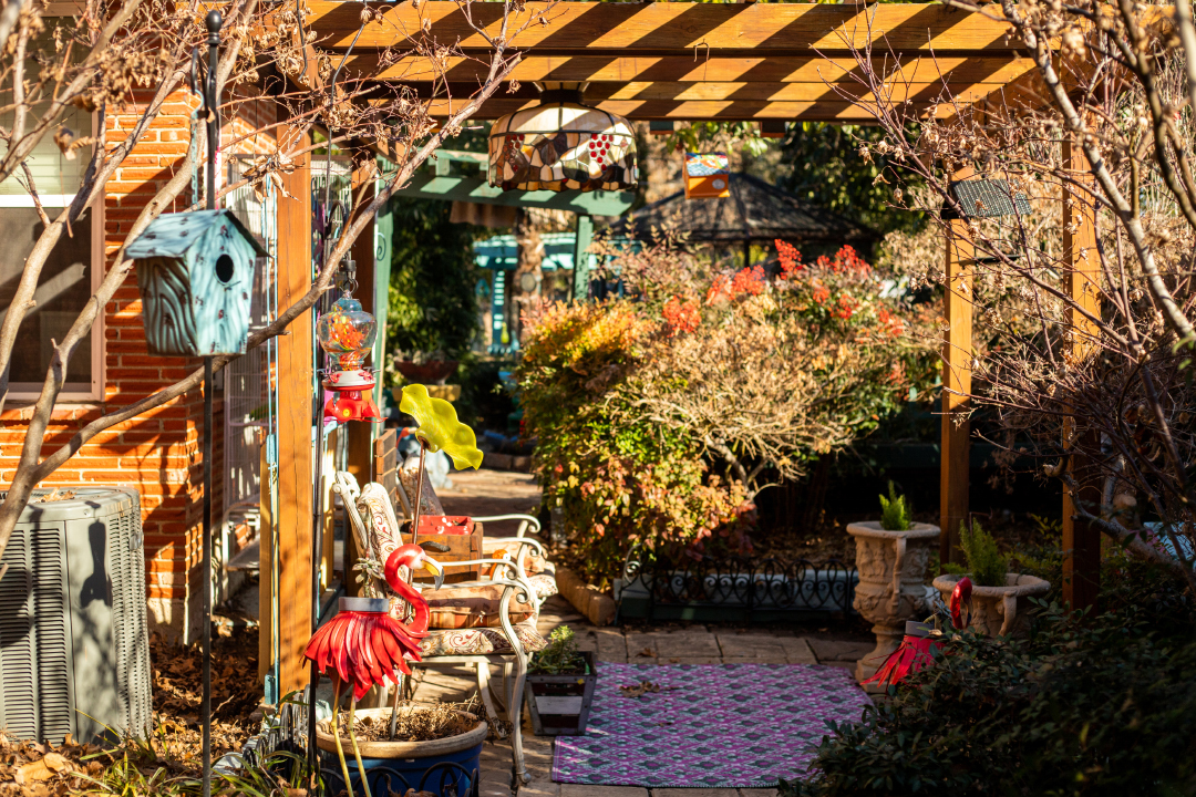 Most eye-catching, though, is the iron fence-enclosed “garden room” created to the side of the home. Step right this way through the screen door, which is framed by an arbor topped with birdhouses of red, orange, blue and green. On either side of the arbor is a picket fence, salvaged from a trash bin at a nearby church.